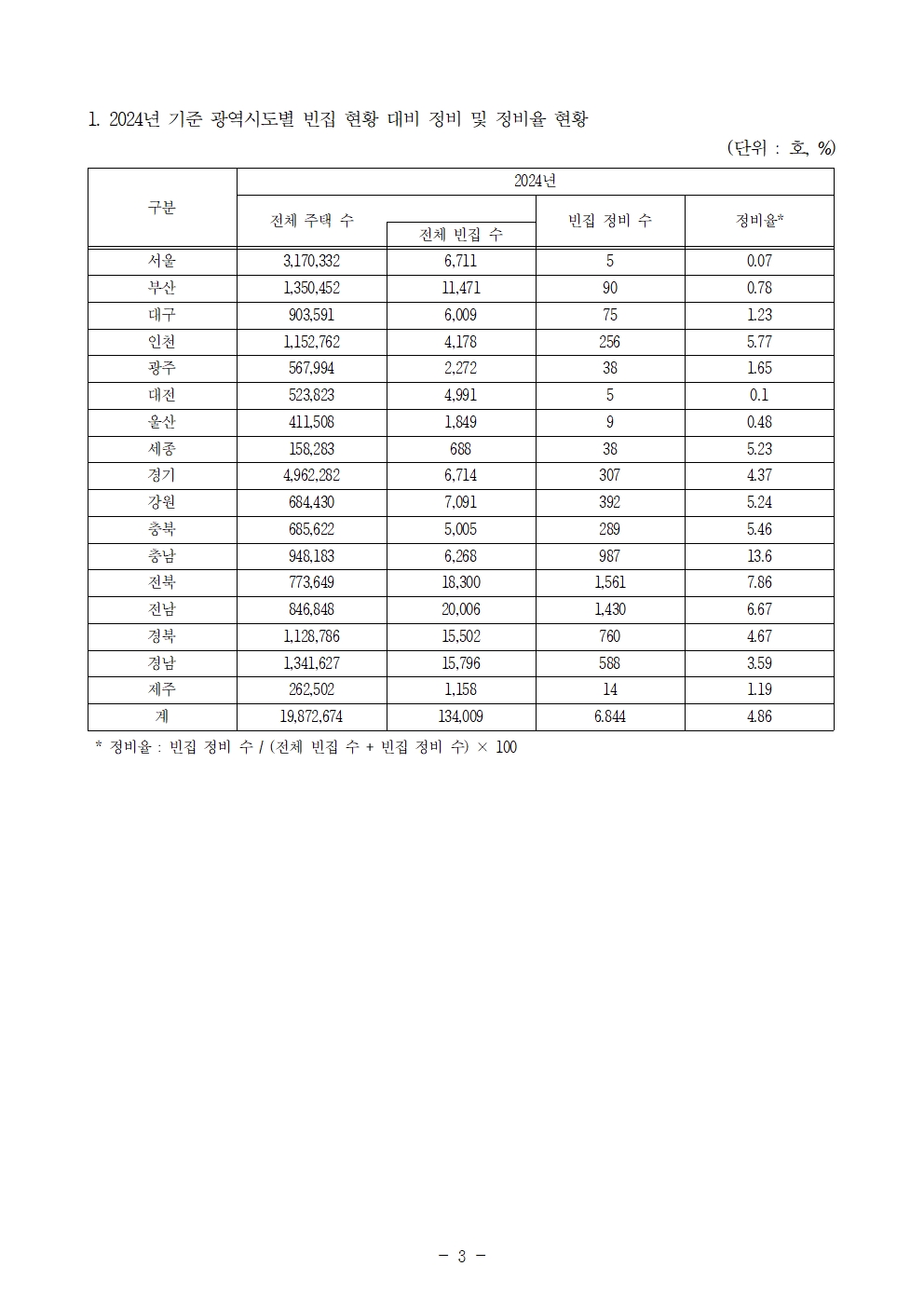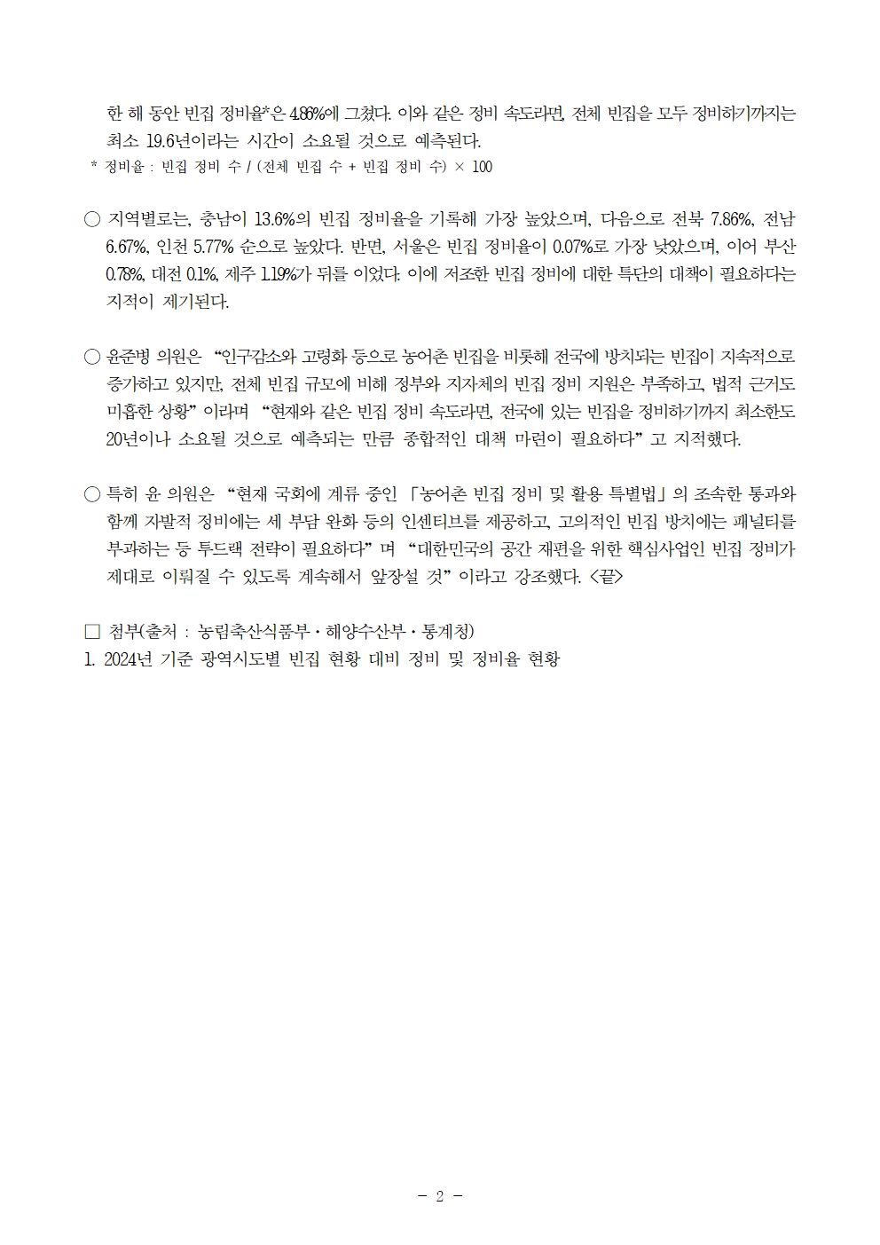 [윤준병 의원 국정감사 보도자료] 2024년 빈집 정비 실적 6,844건, 전체 빈집의 4.86%에 불과