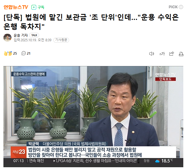 <박균택 / 더불어민주당 의원(국회 법제사법위원회)> "법원이 시중 은행들 배만 불리지 말고 공적 재원으로 활용할 방안을 찾아야 한다고 봅니다…국민들이 소송 과정에서 법원에 맡겨놓은 금액인 만큼 그 수익도 국민에게 돌려드려야 마땅할 것입니다."