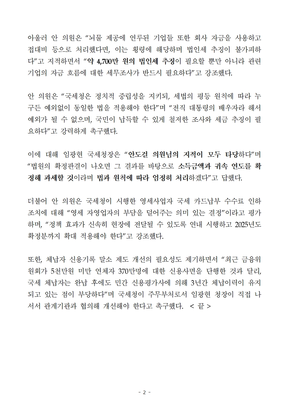 [국회의원 안도걸 보도자료] 김건희 수수 고가품 관련 세금 최대 1억 300만원 과세해야