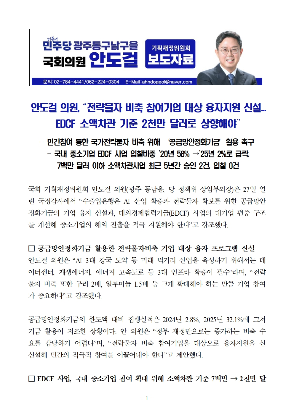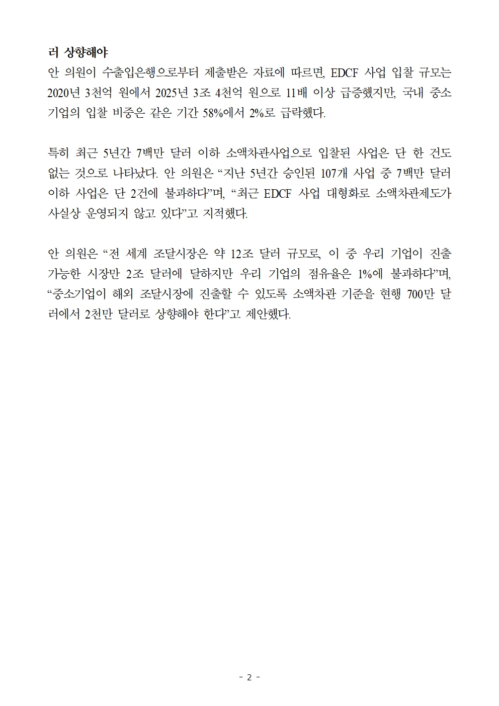[국회의원 안도걸 보도자료] 전략물자 비축 참여기업 대상 융자지원 신설...EDCF 소액차관 기준 2천만 달러로 상향해야