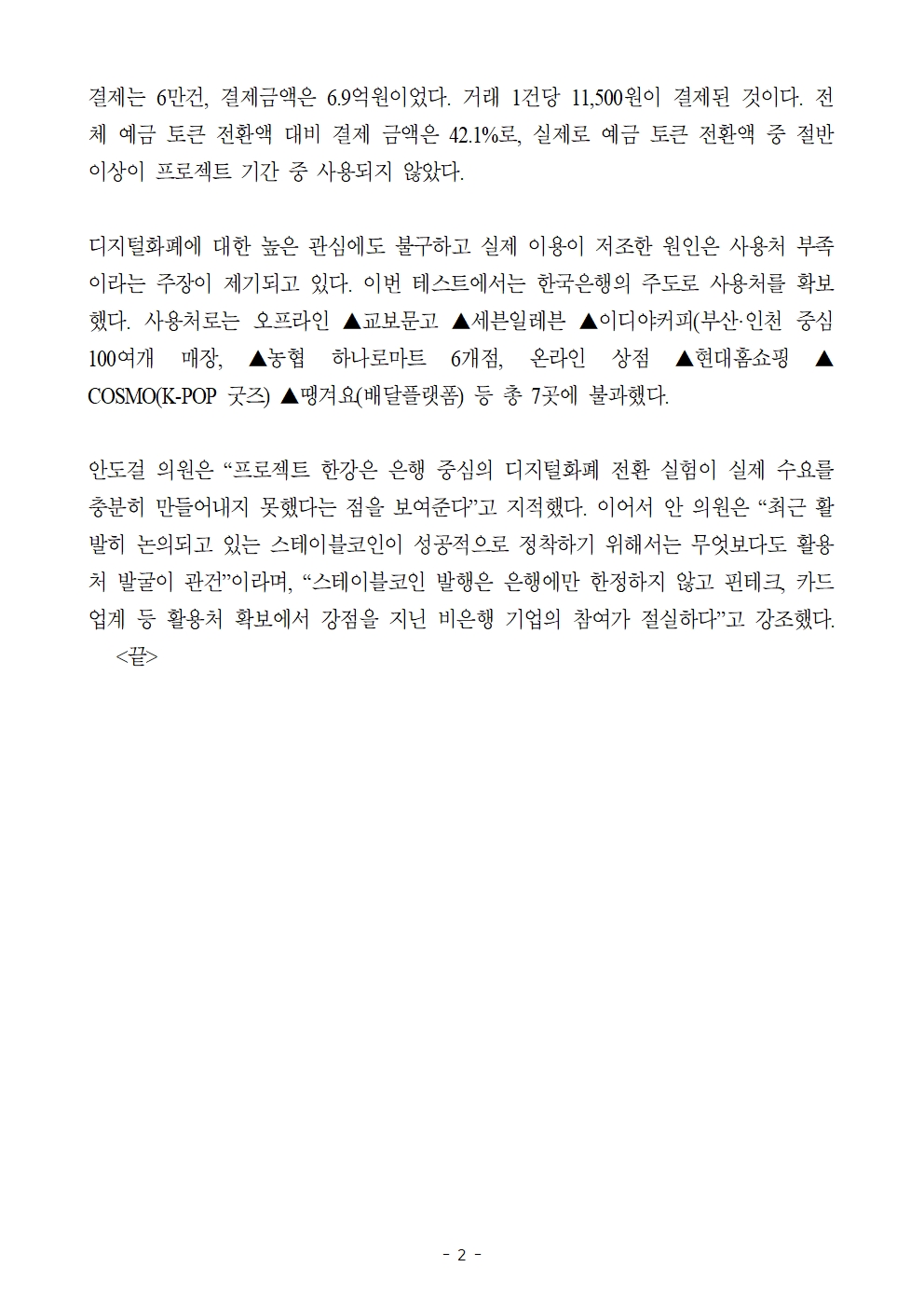 [국회의원 안도걸 보도자료] 프로젝트 한강’, 예금토큰 전환액 57.9% 미사용