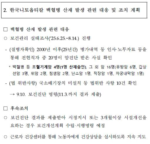 앞서 김주영 의원실이 확보한 자료에 따르면, 노동청이 실시한 니토옵티칼 평택공장 보건관리 실태조사(′25.6.25~8.14) 결과, 재해자가 근무한 용해공정 등에 국소배기장치 미흡 등 10건의 위반사항이 발견됐다. 이에 회사는 지난 9월 10일 보건명령진단을 처분받았다.