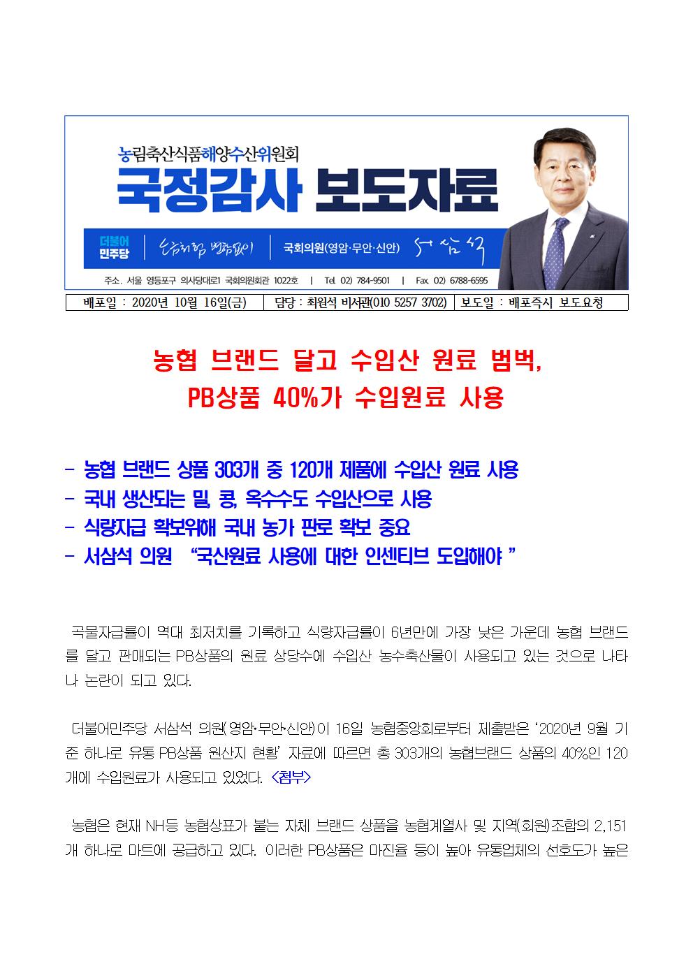 201016서삼석_의원실_국정감사_보도자료_농협_브랜드_달고_수입산_원료_범벅,_PB상품_40%가_수입원료_사용(최종).hwp