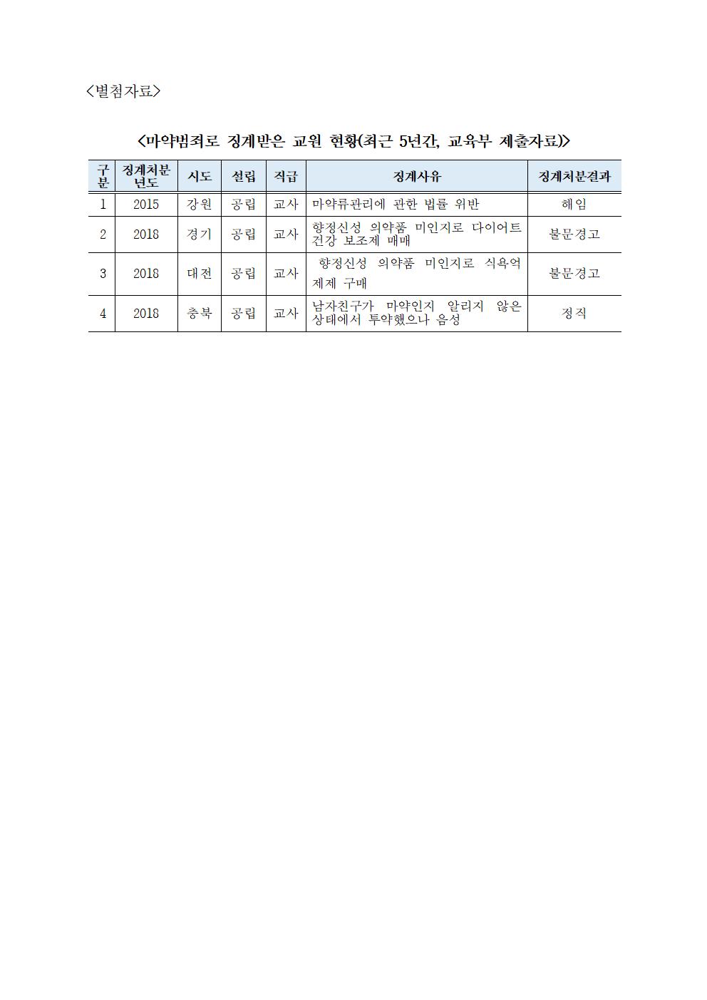 국정감사+보도자료+제43호+최근+5년간+마약범죄+관련+징계교사+4명,+“임용대기자도+마약범죄+연루자+있어”.hwp