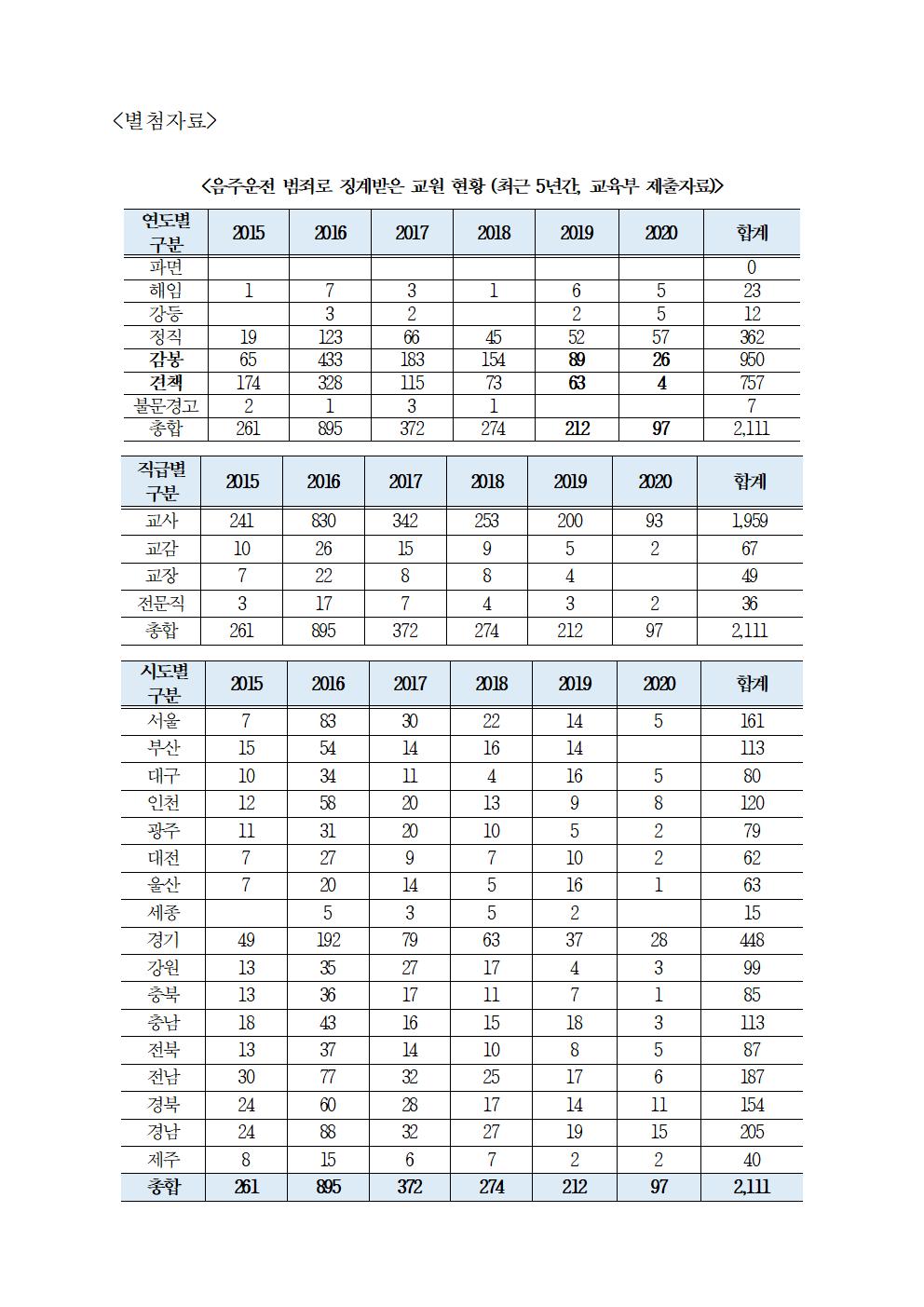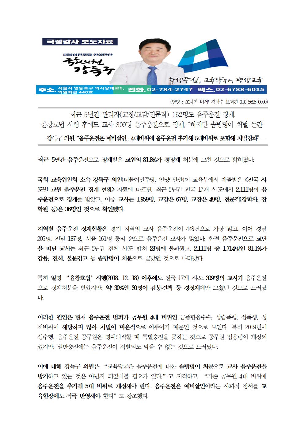 [국회의원 강득구]최근 5년간 관리자(교장/교감/전문직) 152명도 음주운전 징계, 솜방망이 처벌 논란