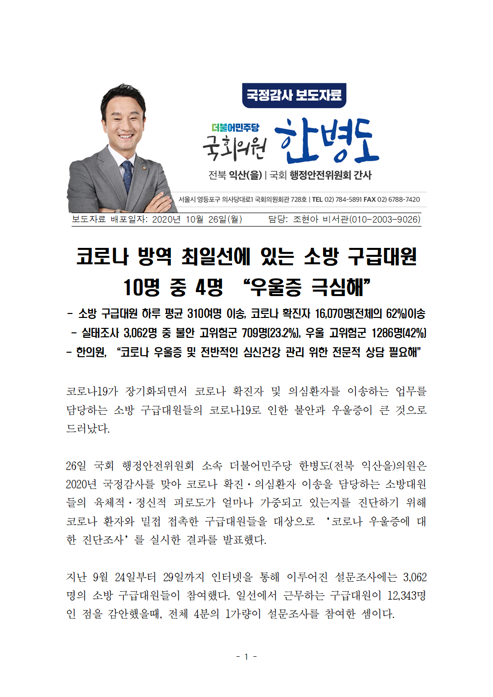 [국회의원 한병도] 20.10.26 코로나 방역 소방 구급대원 10명 중 4명 “우울증 극심해”