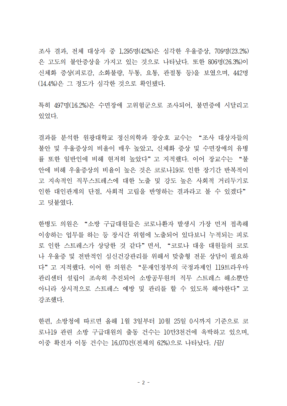한병도_의원2020_10_26_행안위_국정감사_보도자료(48)_코로나방역소방구급대원10명_중_4명_“우울증_극심해”.hwp