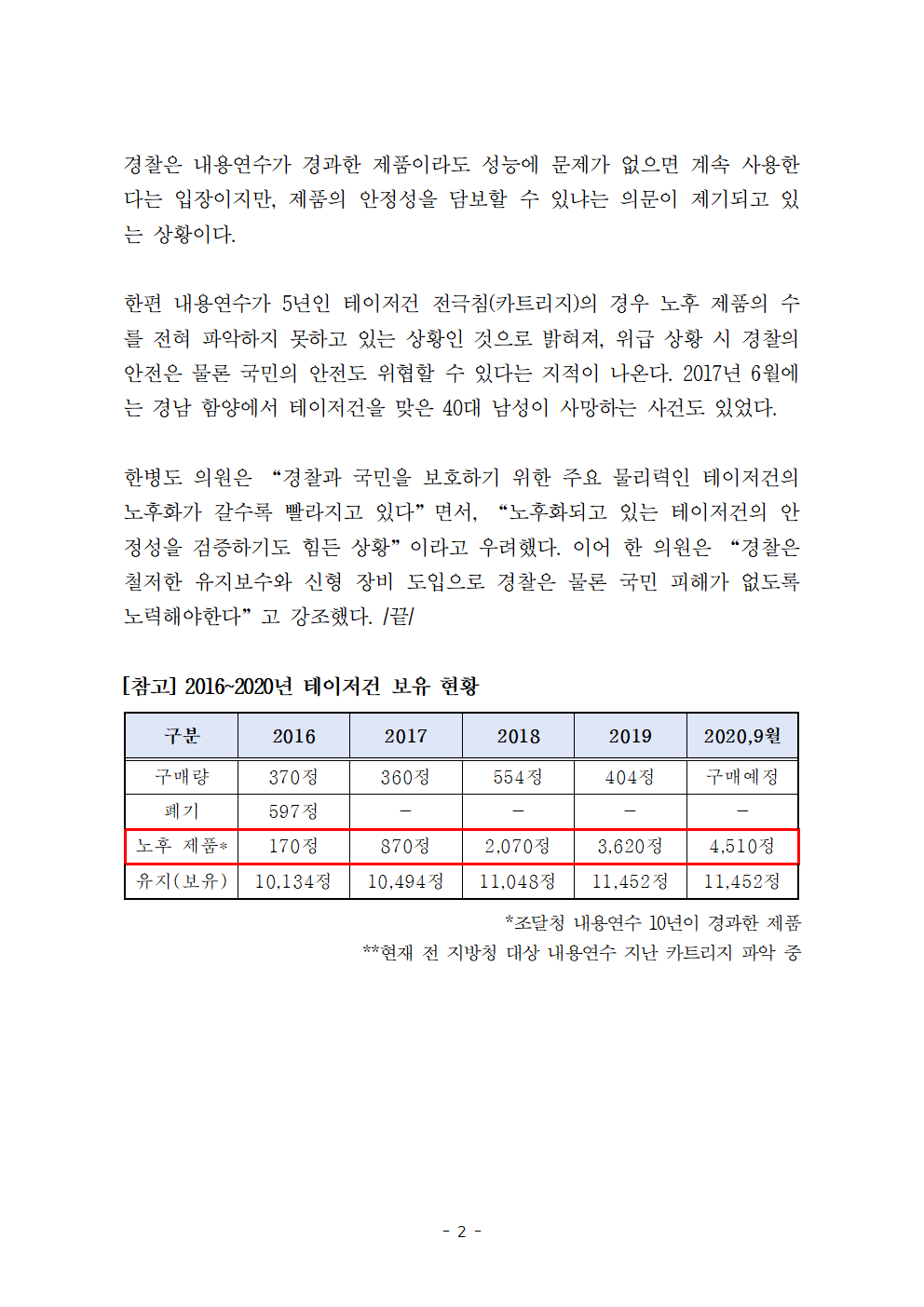[국회의원 한병도] 20.10.26 경찰 테이저건, 10대 중 4대는 ‘노후제품’