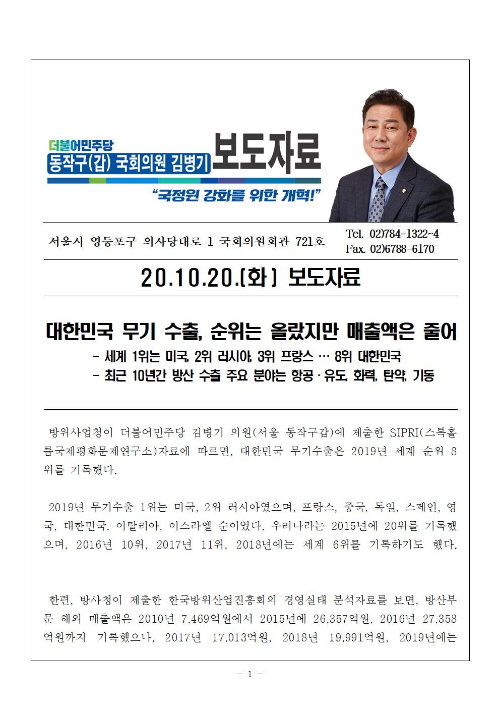 국정감사_김병기의원201020_보도자료(무기수출_순위는_올랐지만_매출액은_줄어).hwp
