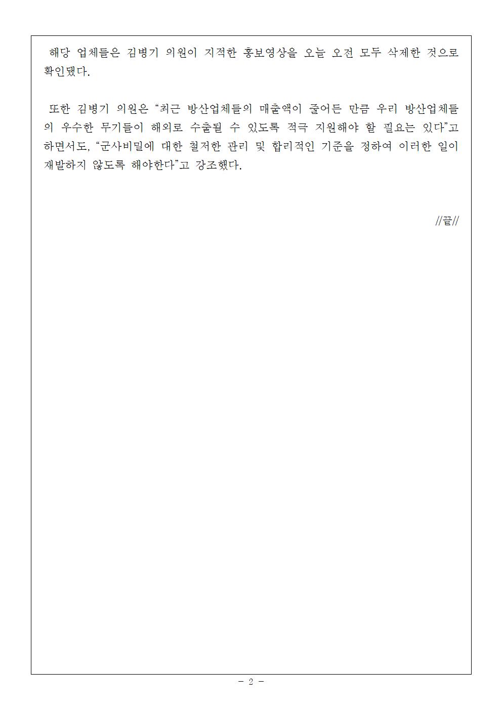 [국회의원 김병기] 손 놓은 군사비밀, 방산업체 홍보용으로 사용돼