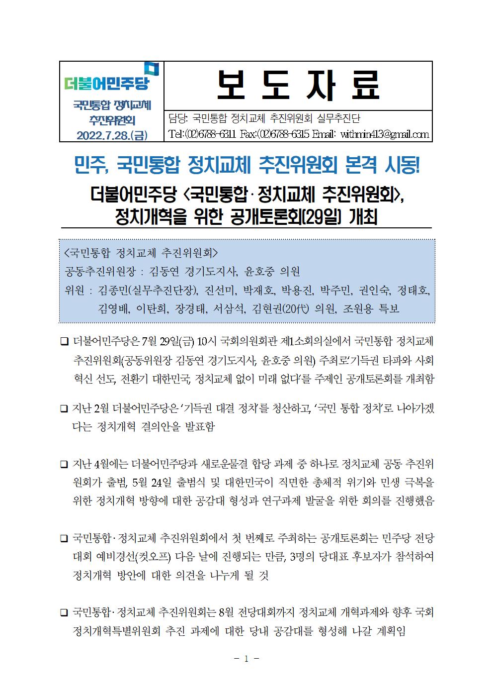 [보도자료] 더불어민주당 국민통합 정치교체 추진위원회 정치개혁 공개토론회 개최