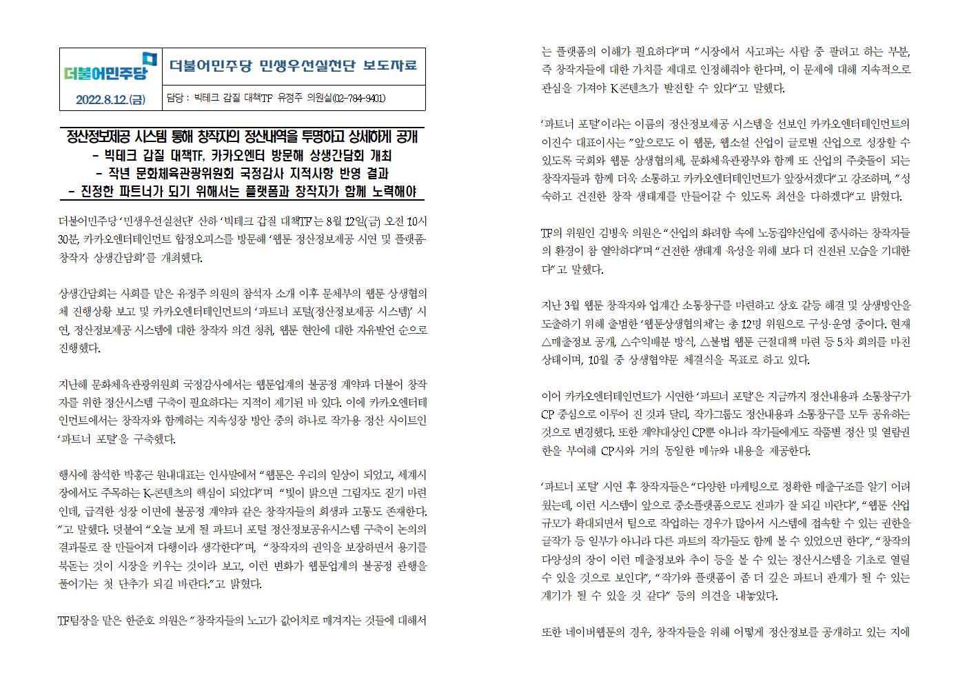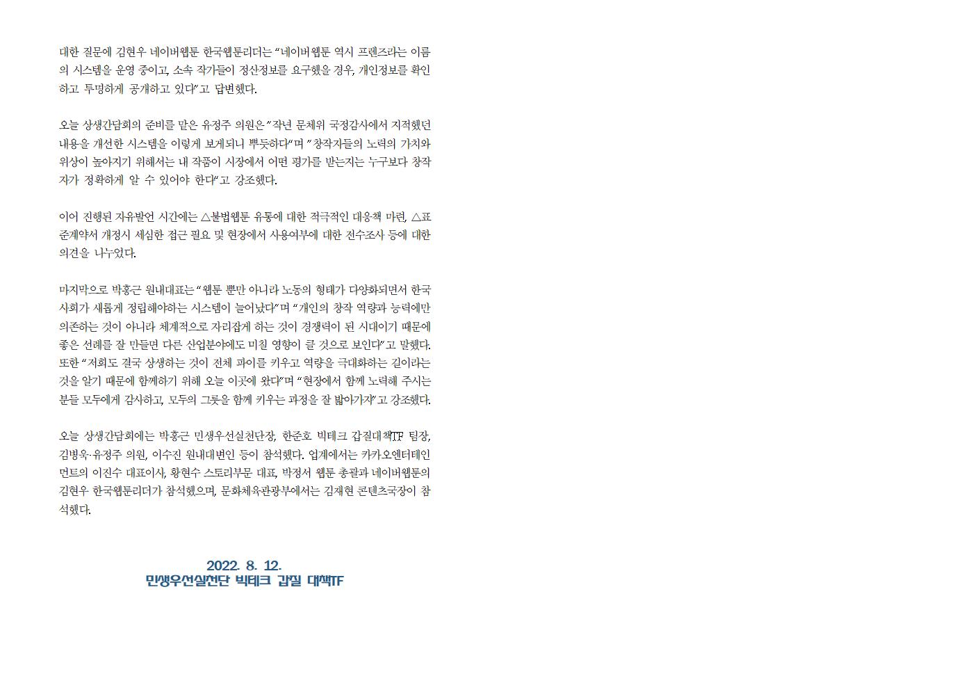 [보도자료] 더불어민주당 민생우선실천단 빅테크갑질대책tf, 웹툰 정산정보제공 시연 및 플랫폼·창작자 상생간담회 개최