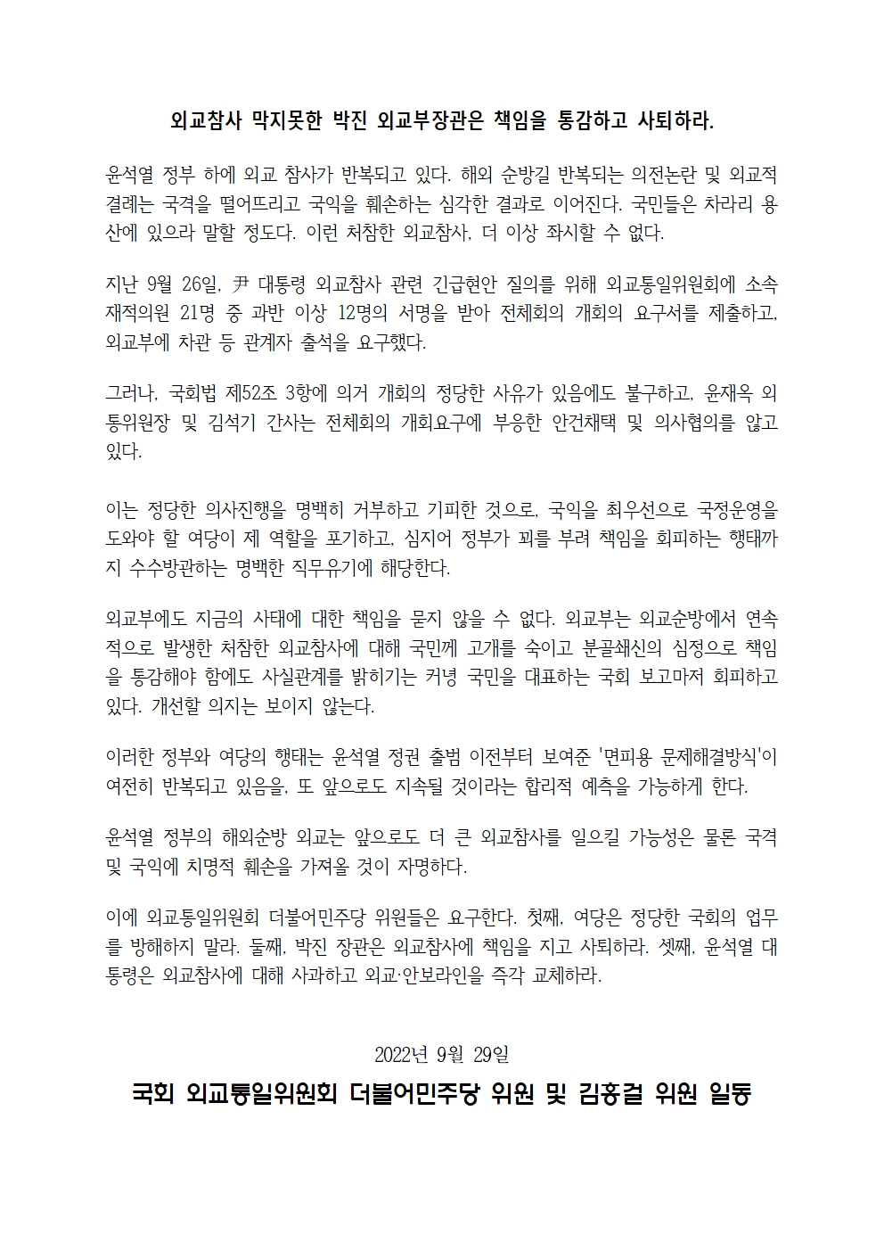 [성명서] 국회 외통위 더불어민주당 위원 및 김홍걸 위원 일동, 외교참사 막지 못한 박진 외교부장관은 책임 통감하고 사퇴하라
