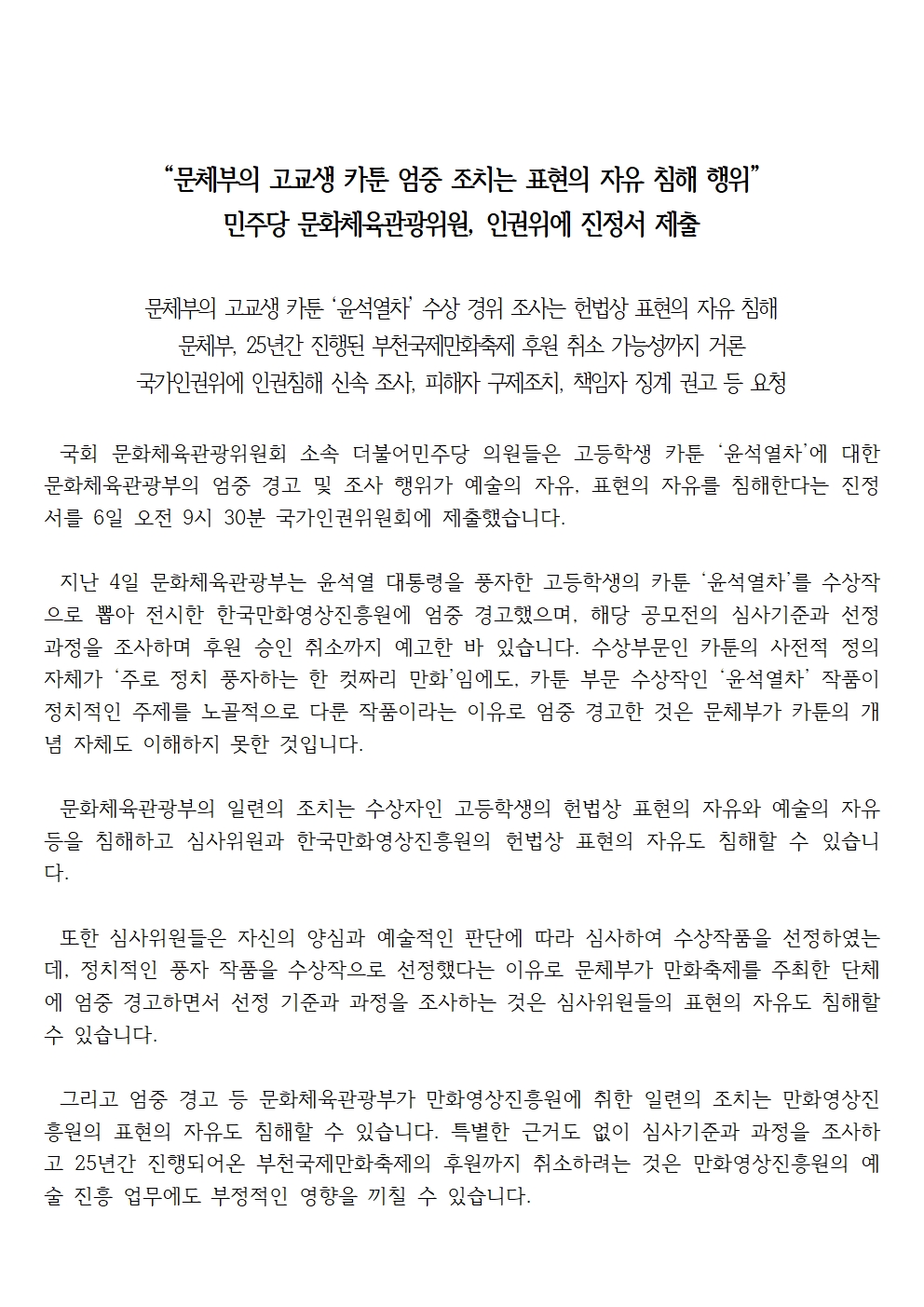 [보도자료] 더불어민주당 문화체육관광위원, "문체부의 고교생 카툰 엄중 조치는 표현의 자유 침해 행위" 인권위에 진정서 제출