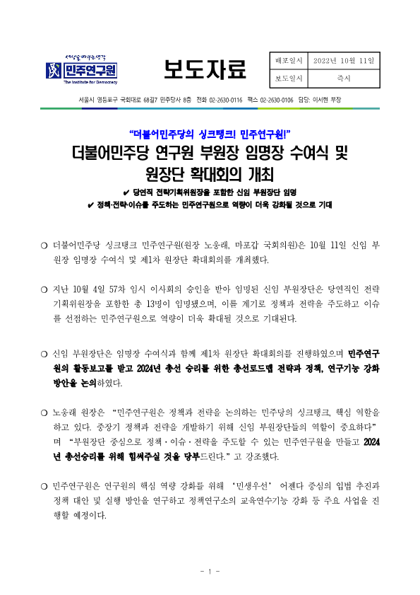 221011_보도자료_민주연구원부원장임명장수여식및제1차원장확대회의_최종파일_수정2.hwp