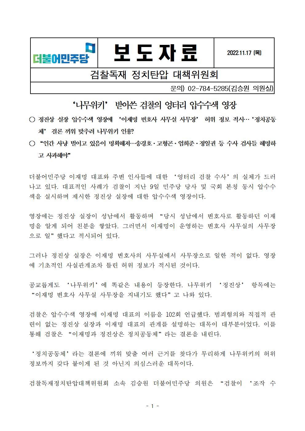 [보도자료] 더불어민주당 검찰독재정치탄압대책위원회, '나무위키' 받아쓴 검찰의 엉터리 압수수색 영장