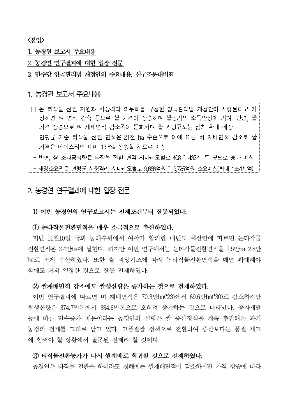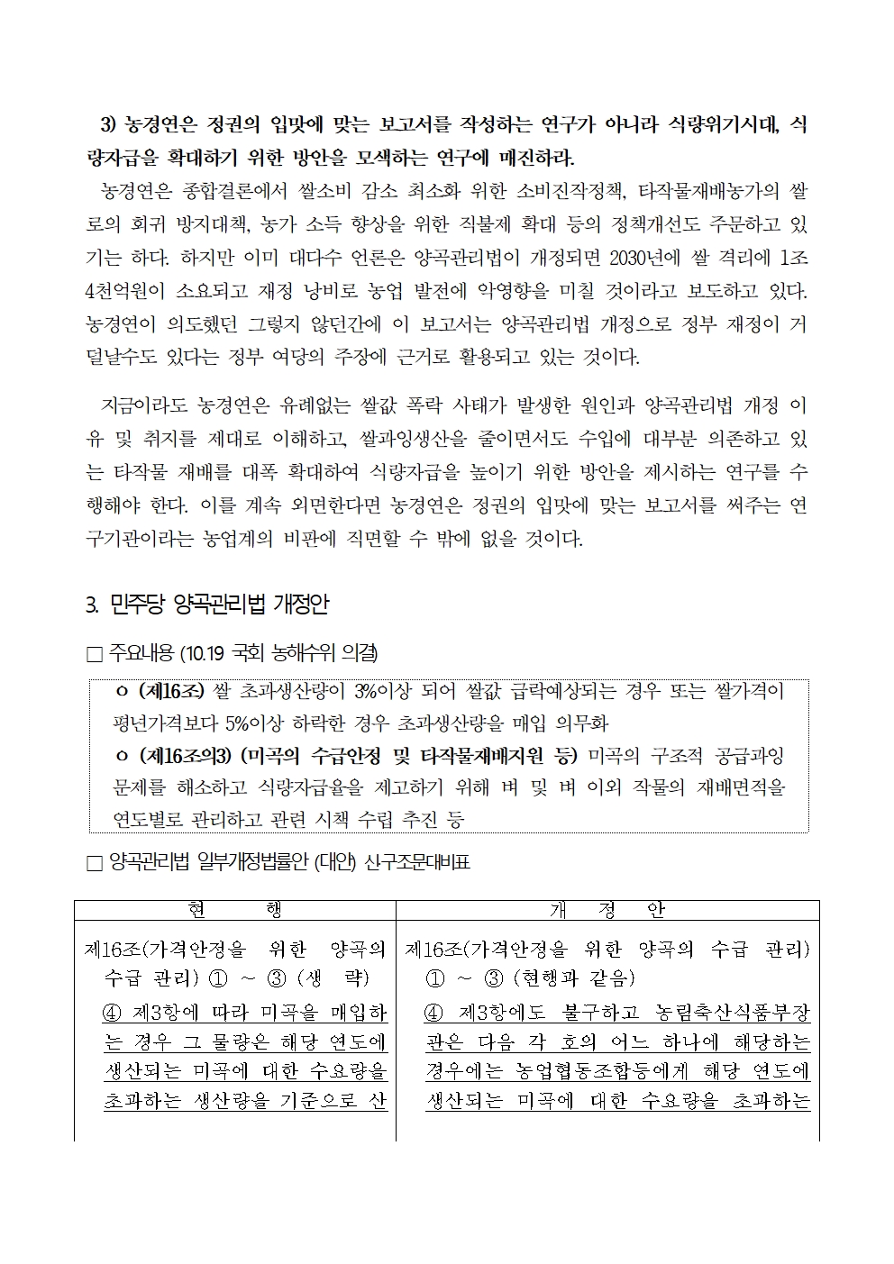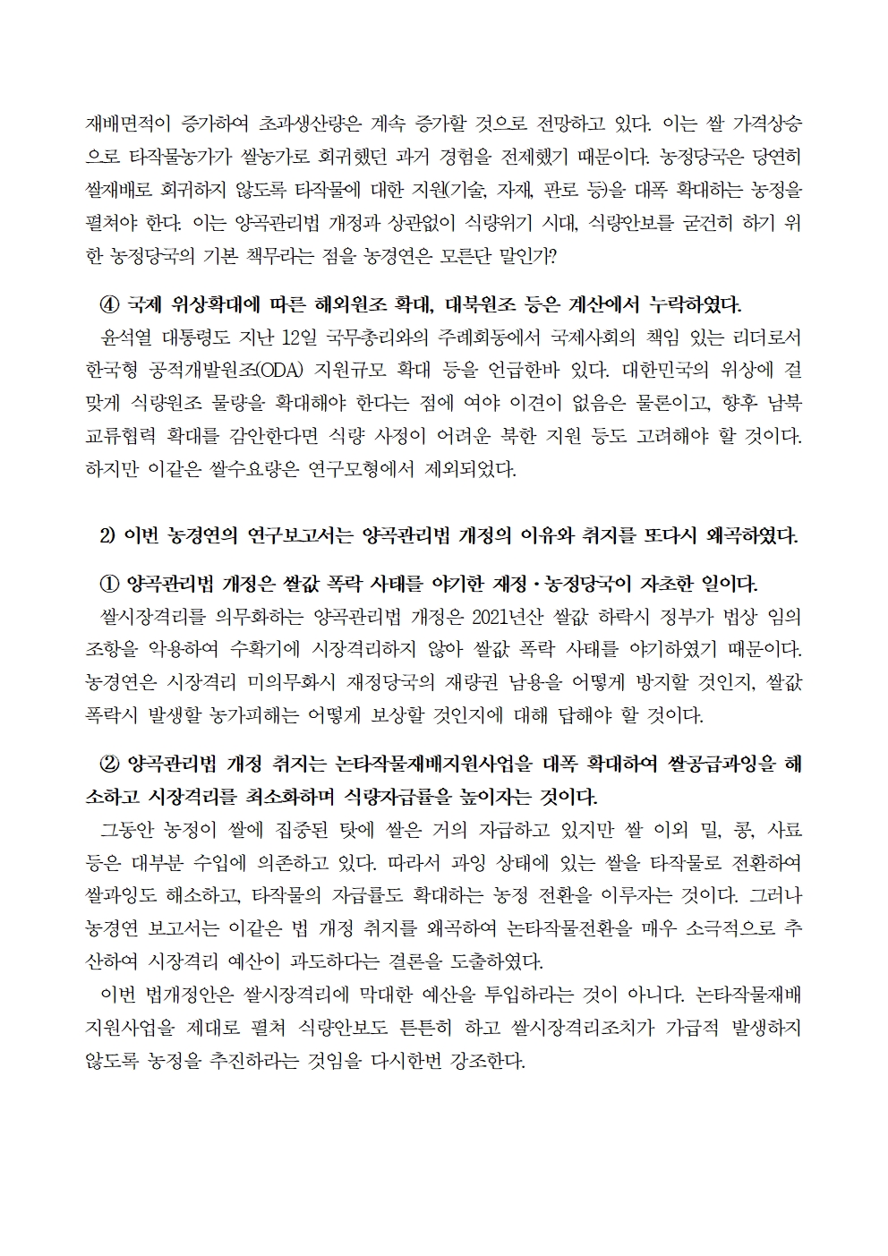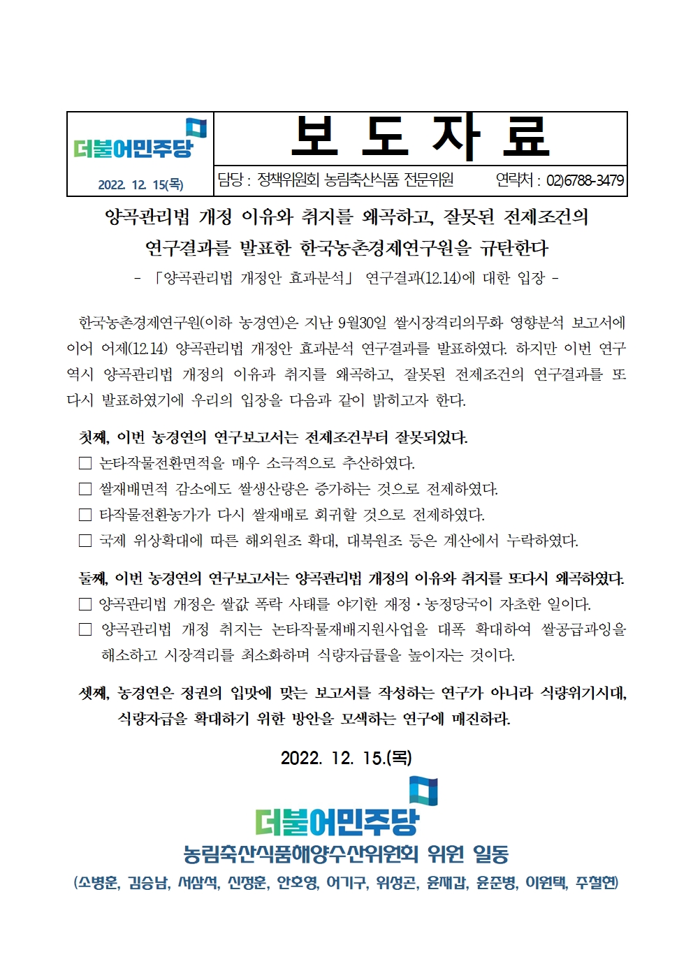 [보도자료] 농림축산식품해양수산위원회 위원 일동, 양곡관리법 개정 이유와 취지를 왜곡하고, 잘못된 전제조건의 연구결과를 발표한 한국농촌경제연구원을 규탄한다