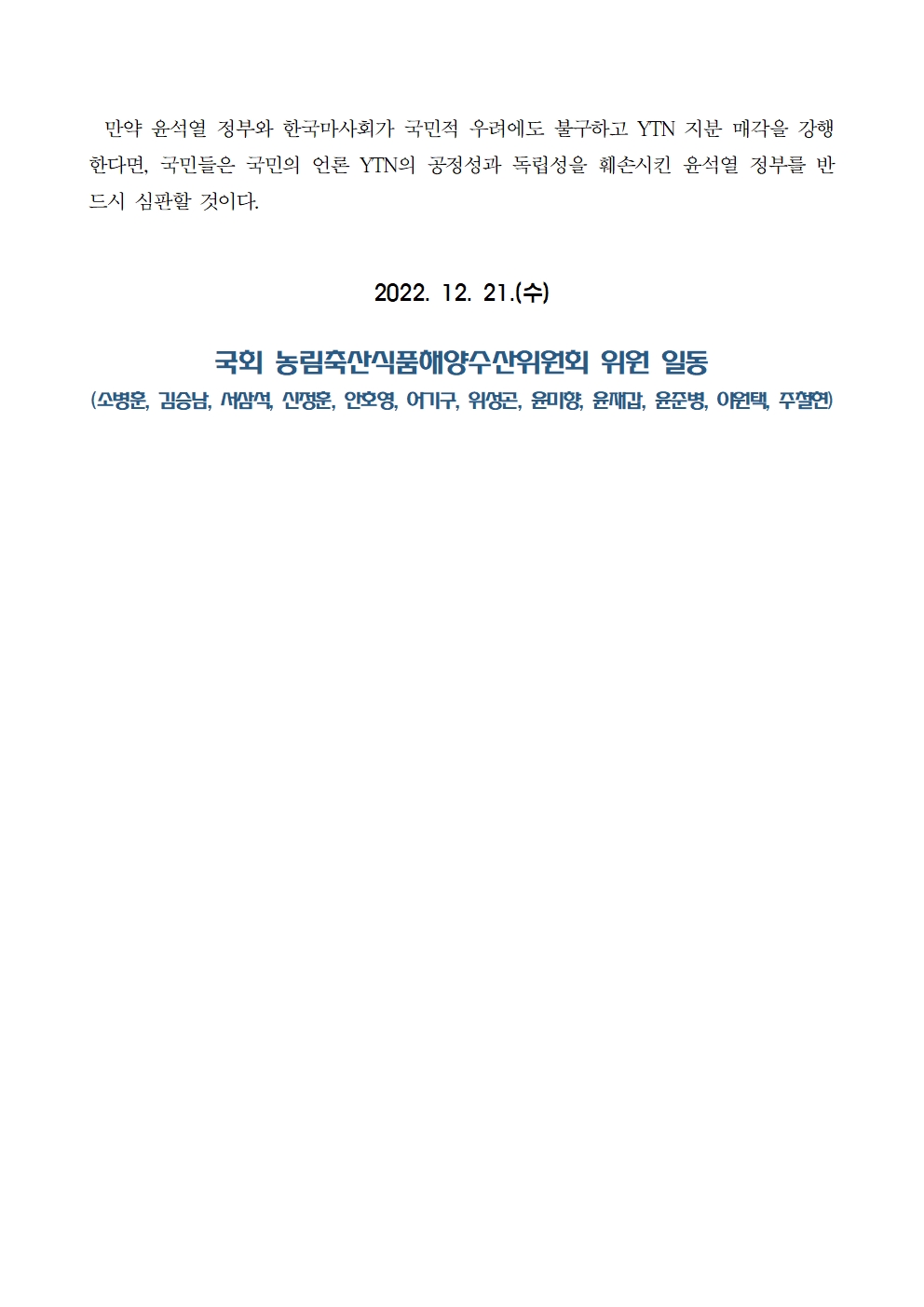 [보도자료] 농림축산식품해양수산위원회, 한국마사회는 언론 공공성 훼손하는 YTN 지분 졸속 매각 중단하라