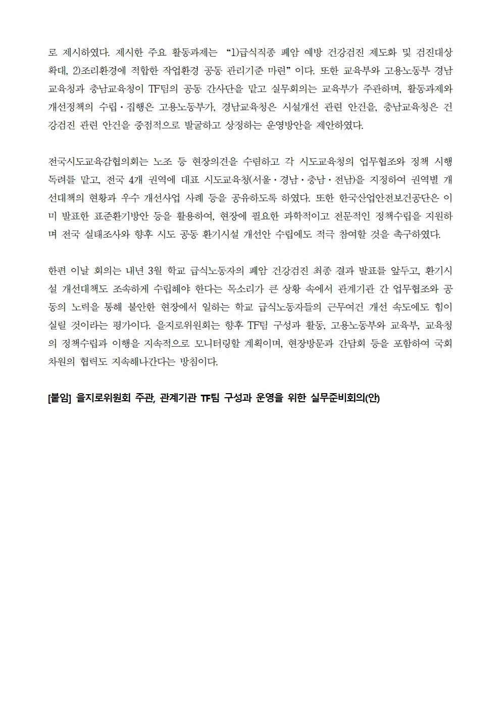 [보도자료] 더불어민주당 을지로위원회, 학교 급식노동자 폐암 진단 관련 관계기관 TF팀 구성과 운영을 위한 실무준비회의 주관