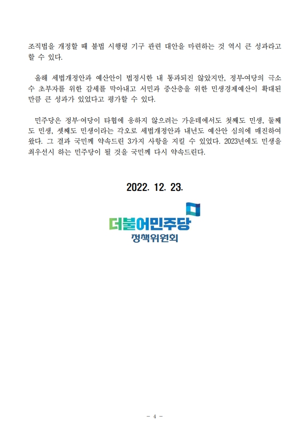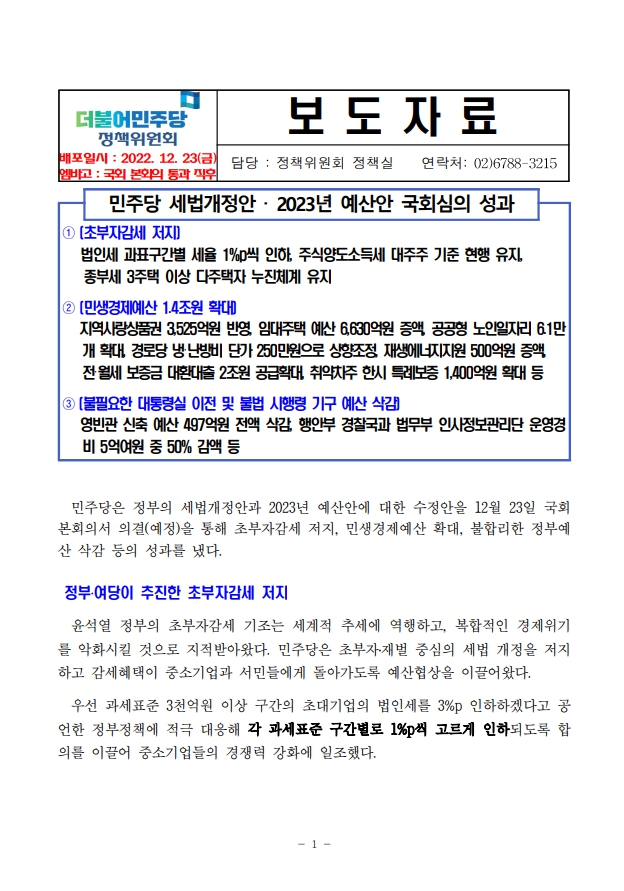 [보도자료] 더불어민주당 정책위원회, 민주당 세법개정안 · 2023년 예산안 국회심의 성과