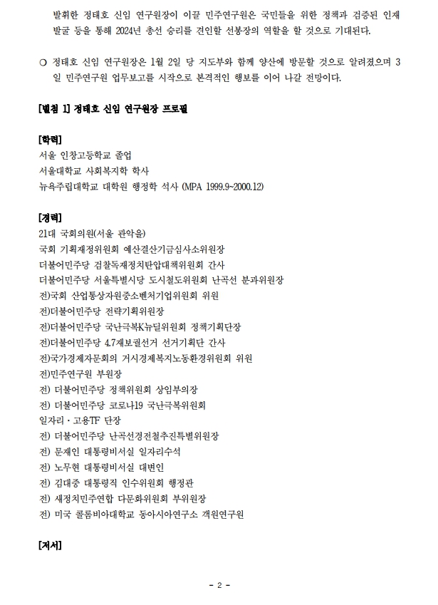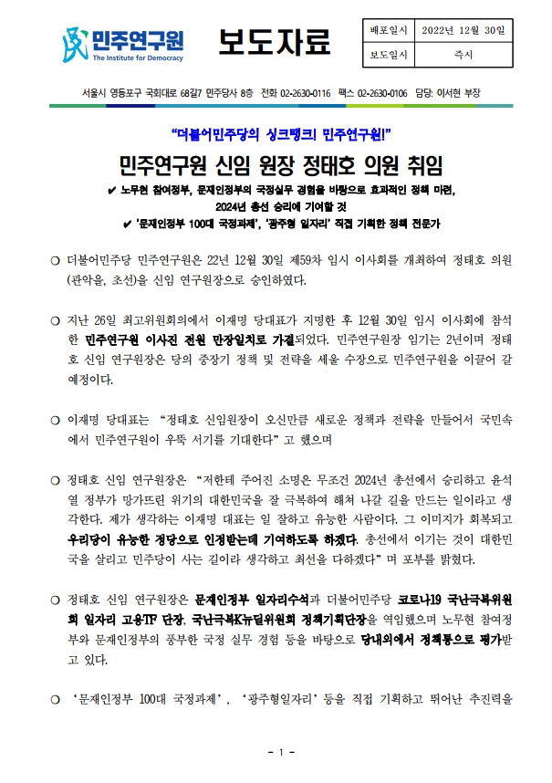 [보도자료] 더불어민주당 민주연구원, 신임 원장에 정태호 의원 취임