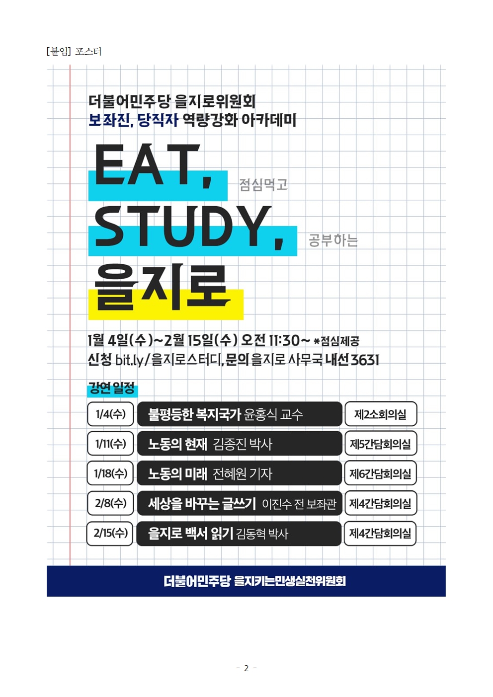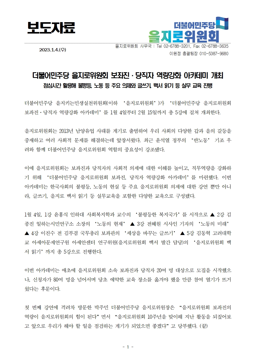 [보도자료] 더불어민주당 을지로위원회, 보좌진·당직자 역량강화 아카데미 개최