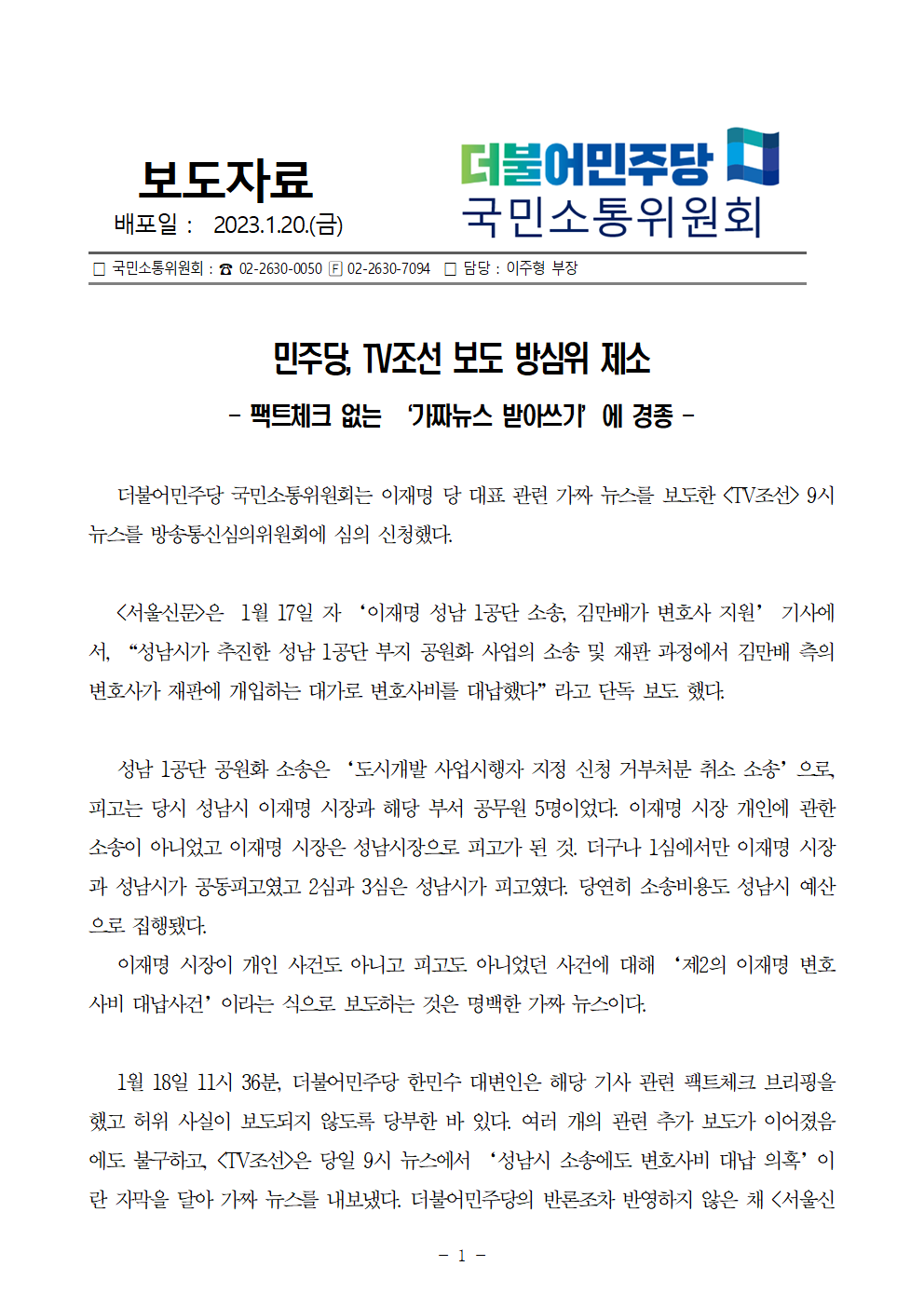 [보도자료] 더불어민주당 국민소통위원회, '민주당, TV조선 보도 방심위 제소'