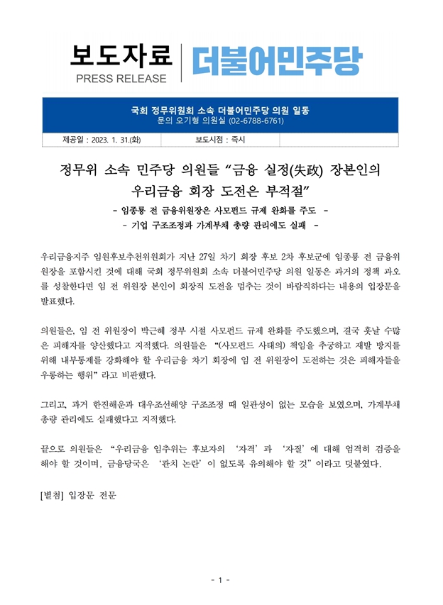 [보도자료] 정무위 소속 민주당 의원들 "금융 실정 장본인의 우리금융 회장 도전은 부적절"