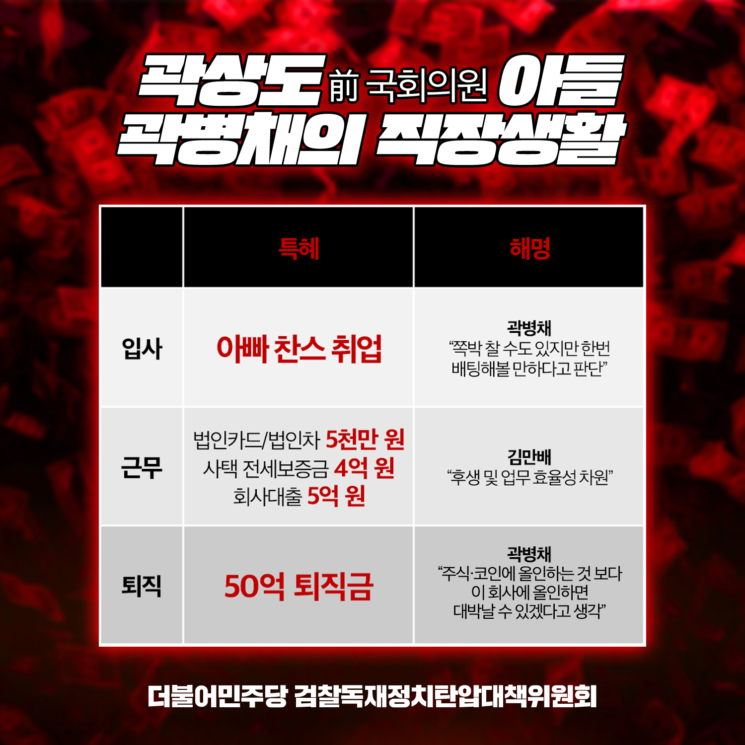 입사·노동·퇴직 모든 과정에서 국민 상식과는 동떨어진 불공정의 모범 곽병채씨의 직장생활은 검사·민정수석·국민의힘 국회의원 곽상도의 아들이 아니었으면 불가능한 일입니다. 공정을 기치로 집권한 윤석열 정부와 국민의힘은 여기에 어떠한 반응조차 없습니다.