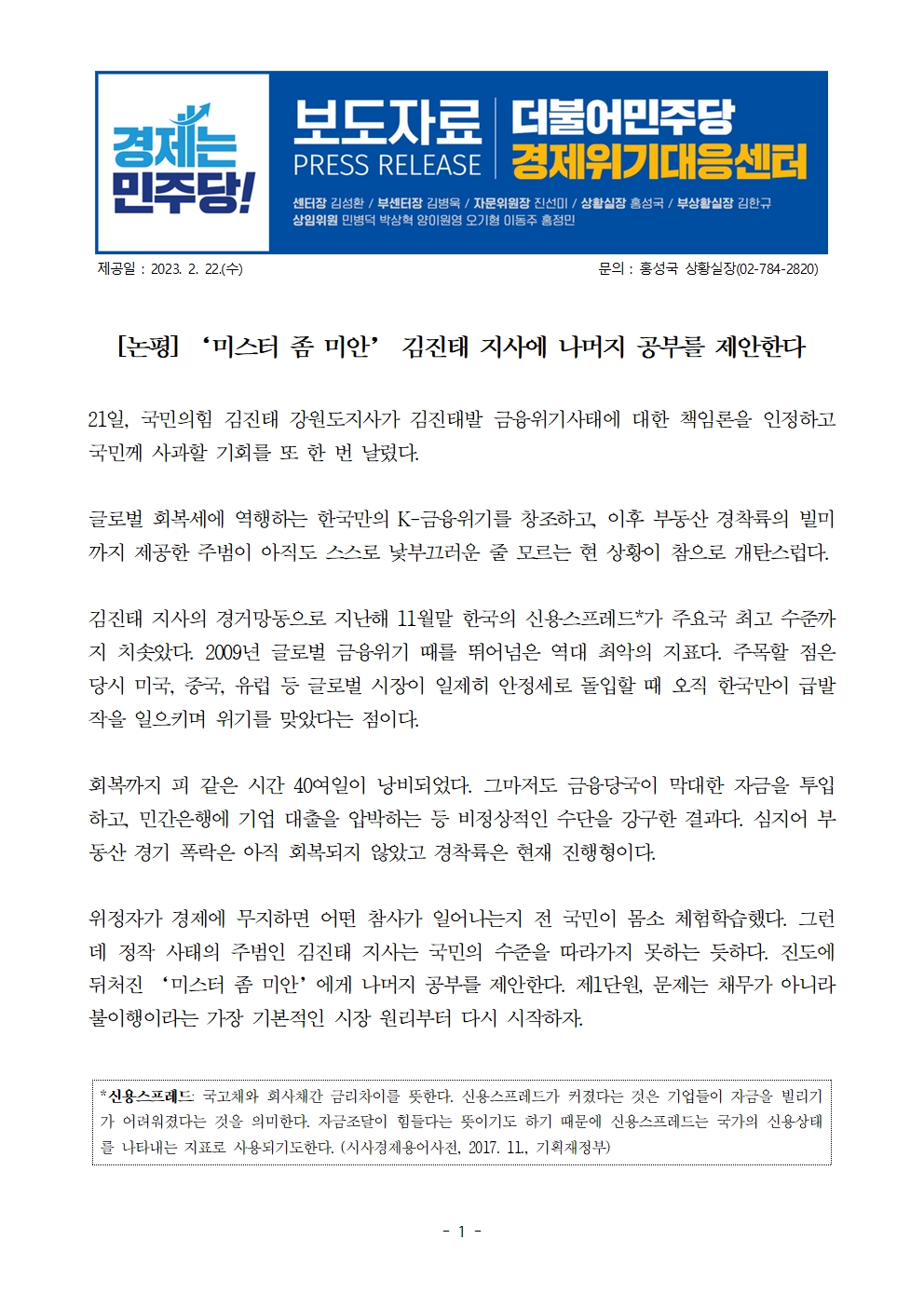 [보도자료] 더불어민주당 경제위기대응센터, ‘미스터 좀 미안’ 김진태 지사에 나머지 공부를 제안한다