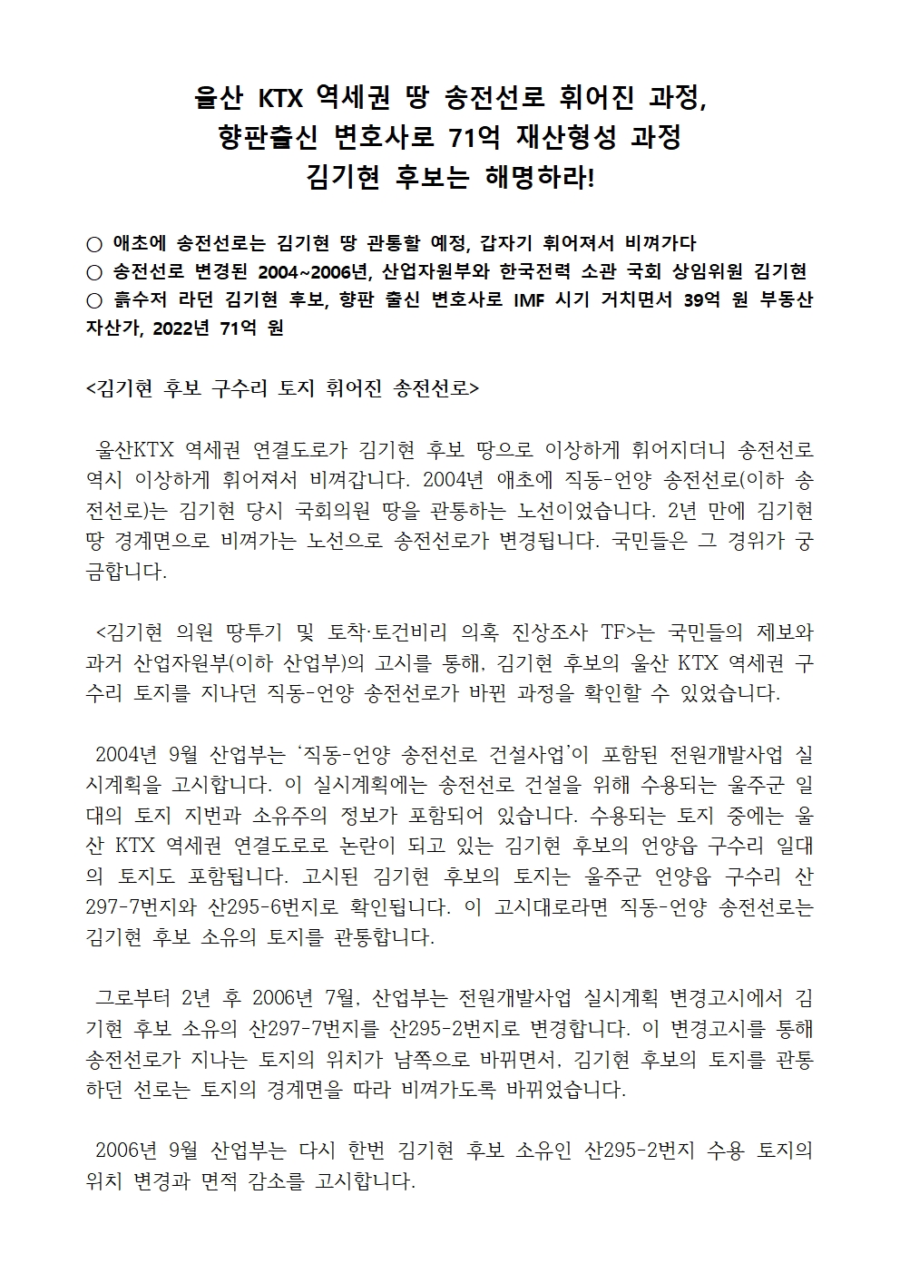 [기자회견문] 김기현 의원 땅투기 및 토착·토건비리 의혹 진상조사 TF, 울산 KTX 역세권 땅 송전선로 휘어진 과정, 향판출신 변호사로 71억 재산형성 과정 해명하라!