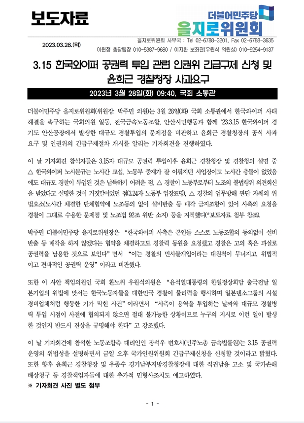 [보도자료] 더불어민주당 을지로위원회, 3.15 한국와이퍼 공권력 투입 관련 인권위 긴급구제 신청 및 윤희근 경찰청장 사과 요구