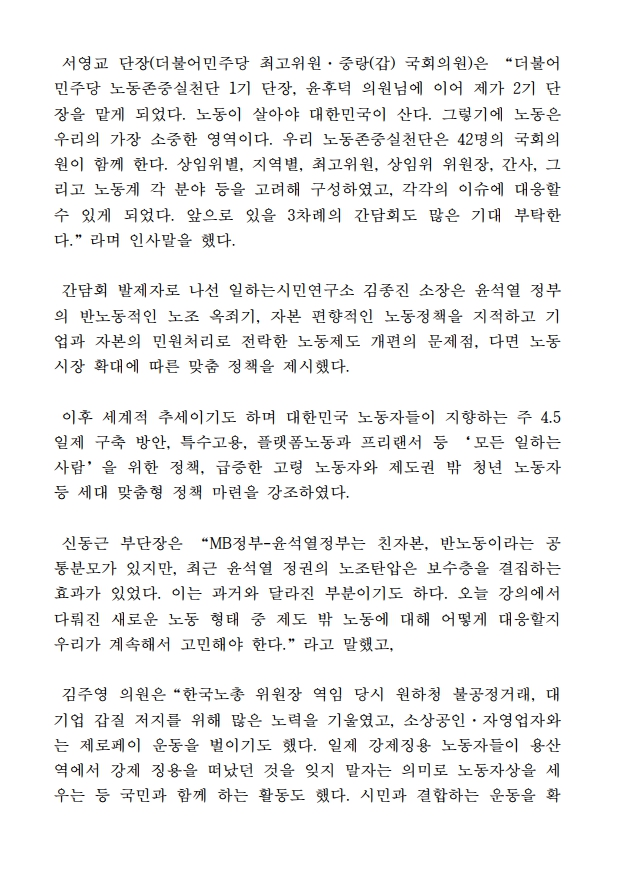 [보도자료] 더불어민주당 노동존중실천단, 제1차 연속간담회 개최