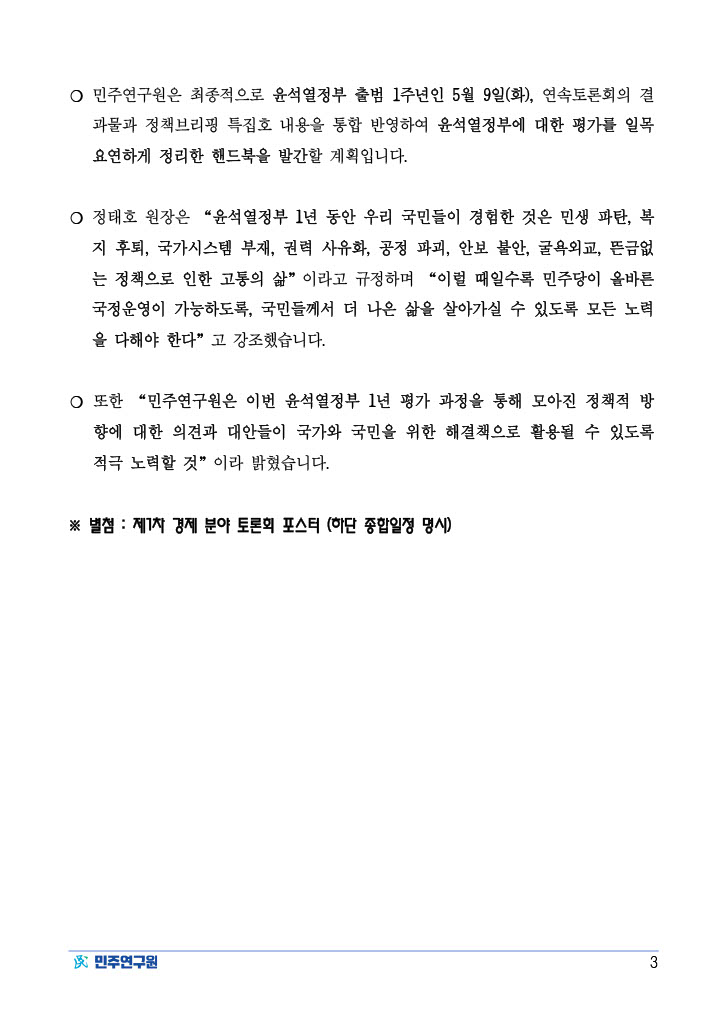 [보도자료] 더불어민주당 민주연구원, 윤석열정부 1년 평가 연속토론회 개최하고 정부실정 지적 '정책브리핑 특집호' 및 핸드북 발간
