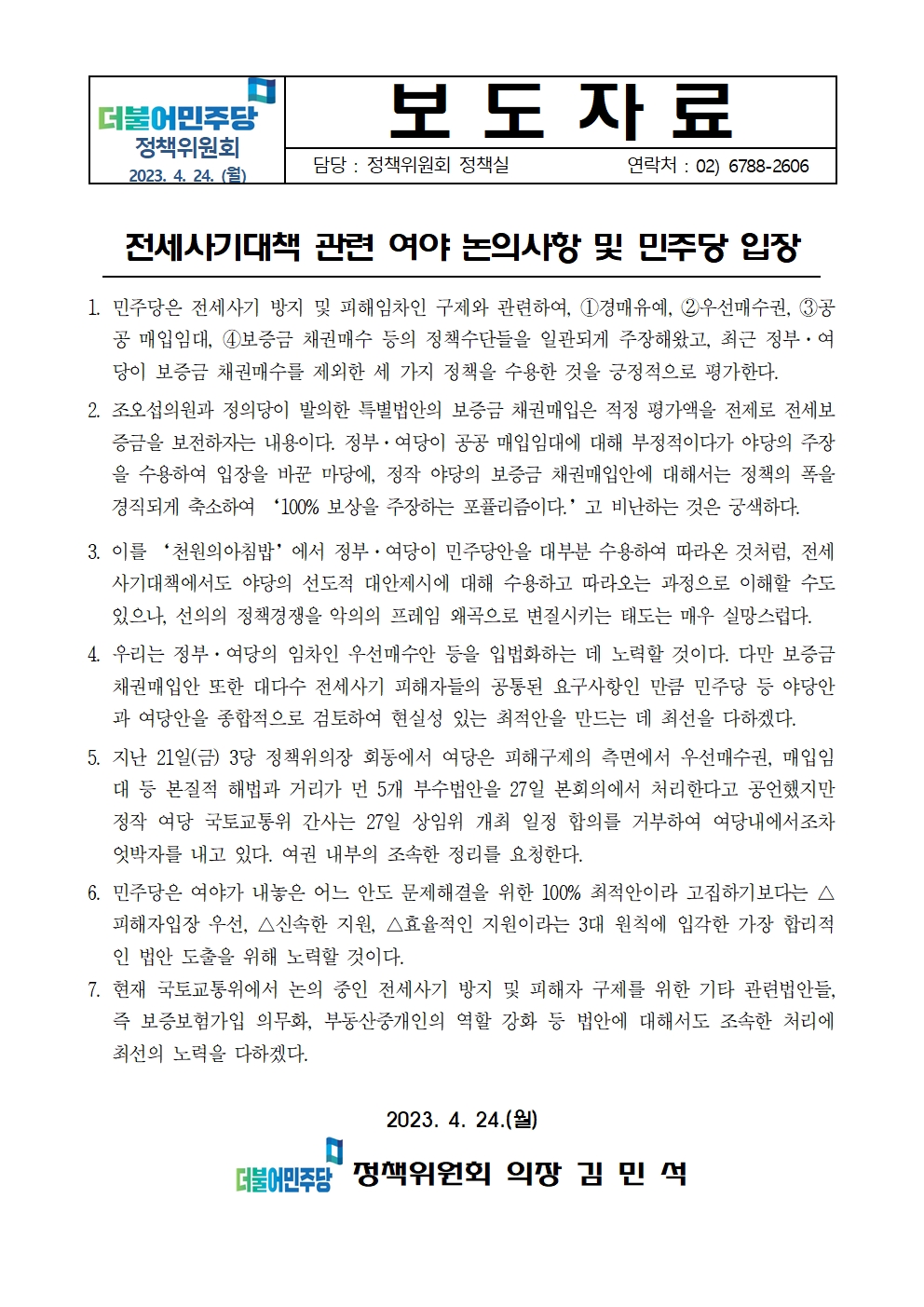 [보도자료] 더불어민주당 정책위원회, 전세사기대책 관련 여야 논의사항 및 민주당 입장