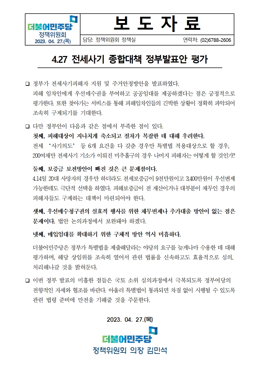 [보도자료] 더불어민주당 정책위원회, 4.27 전세사기 종합대책 정부발표안 평가