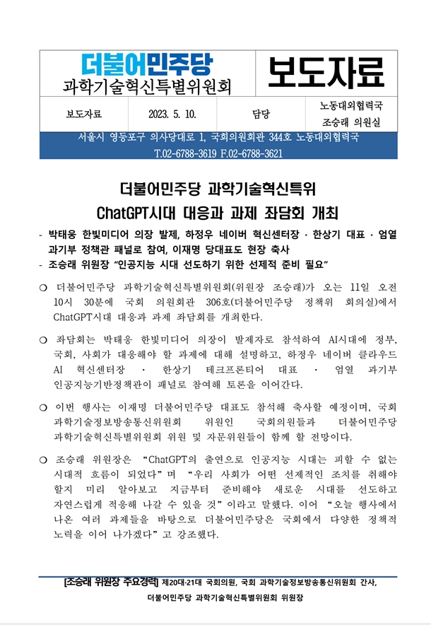 [보도자료] 더불어민주당 과학기술혁신특별위원회, ChatGPT시대 대응과 과제 좌담회 개최