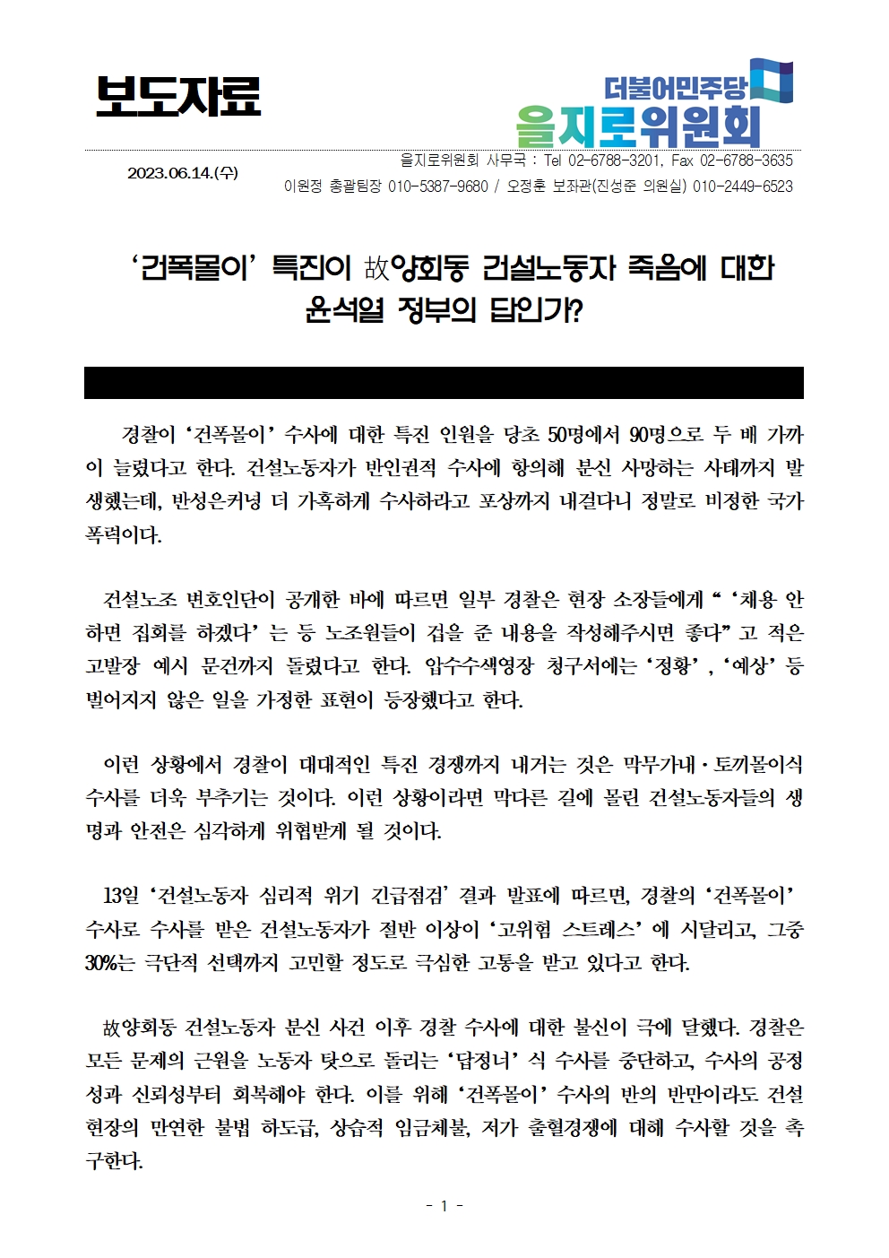 [보도자료] 더불어민주당 을지로위원회, ‘건폭몰이’특진이 故양회동 건설노동자 죽음에 대한 윤석열 정부의 답인가?