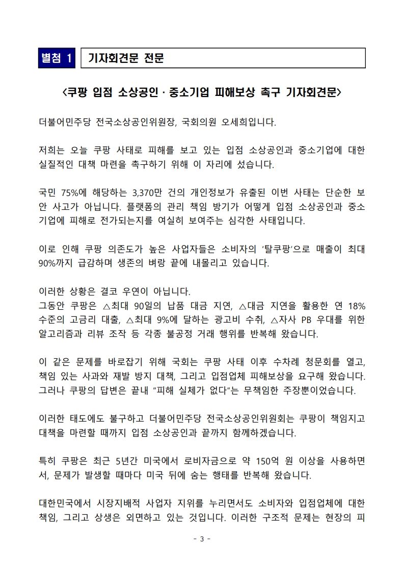 더불어민주당 전국소상공인위원회, 쿠팡 입점 소상공인 중소기업 피해보상 촉구 기자회견 개최