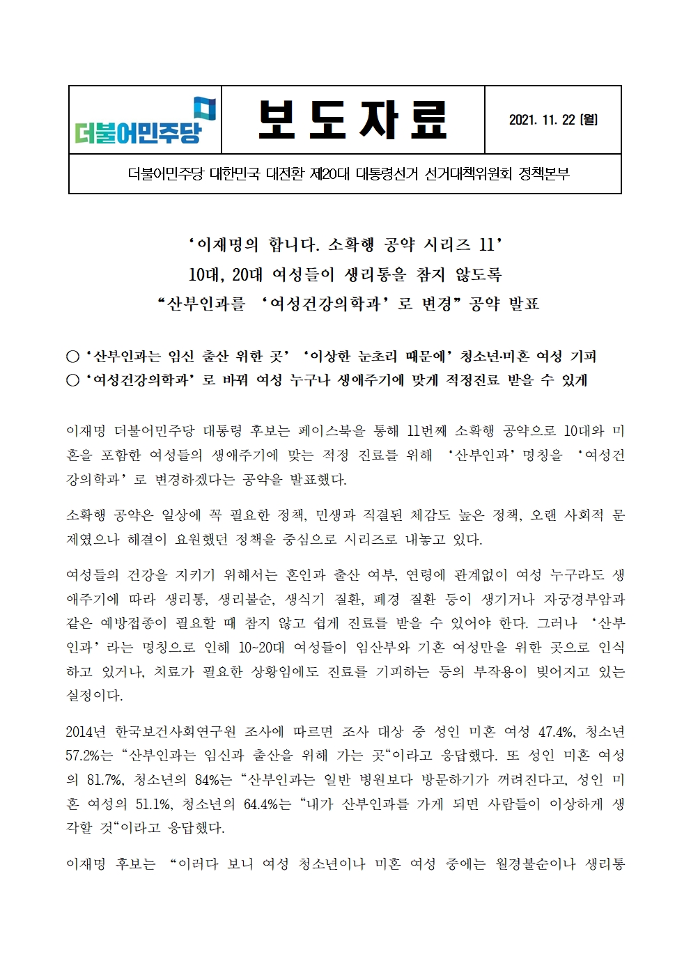 [보도자료] 더불어민주당 선대위 정책본부, '이재명의 합니다. 소확행 공약 시리즈 11'