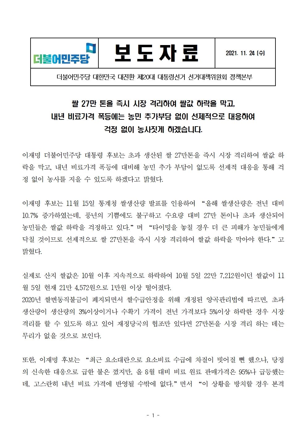 [보도자료] 쌀 27만 톤을 즉시 시장 격리하여 쌀값 하락을 막고, 내년 비료가격 폭등에는 농민 추가부담 없이 선제적으로 대응하여 걱정 없이 농사짓게 하겠습니다.
