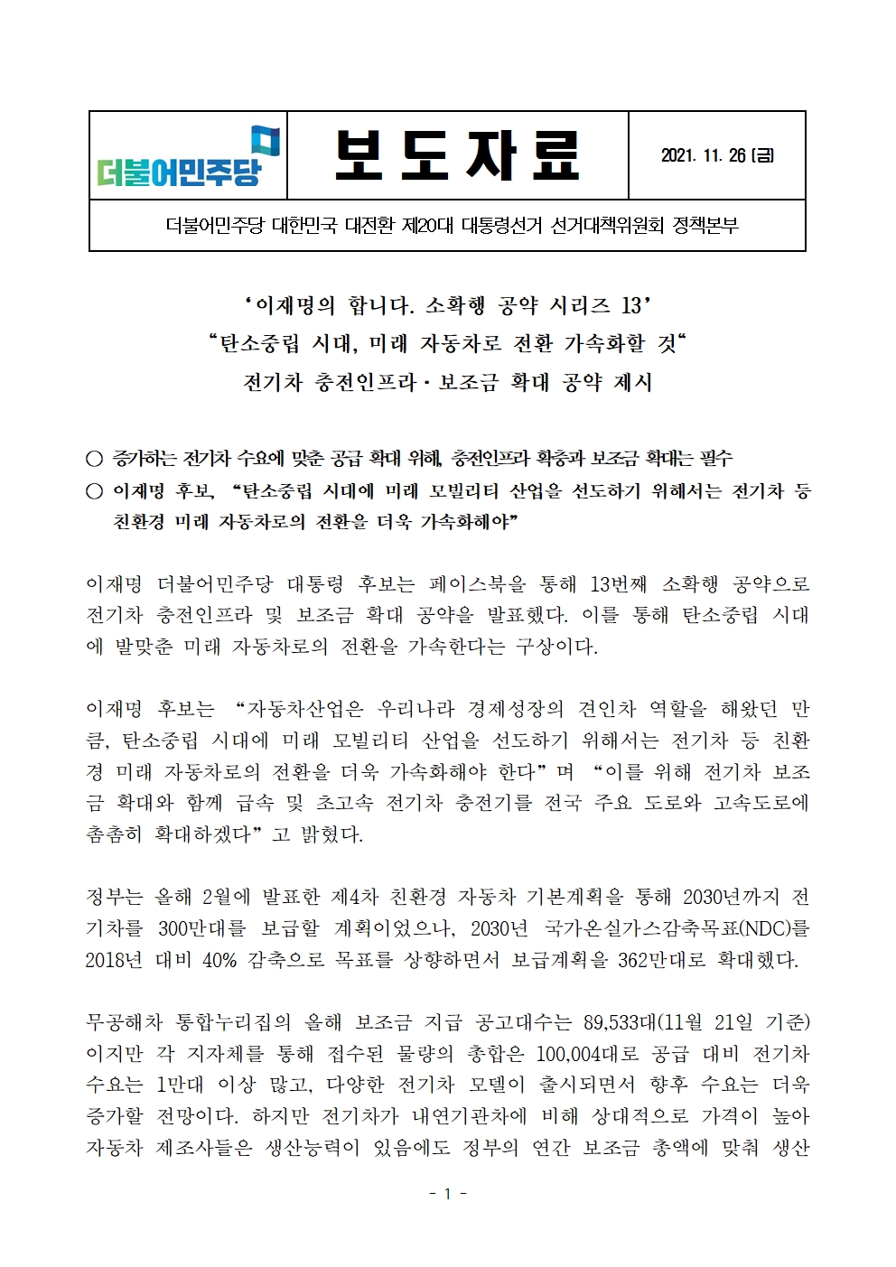 [보도자료] 더불어민주당 선대위 정책본부, '이재명의 합니다. 소확행 공약 시리즈 13' 전기차 충전인프라·보조금 확대 공약