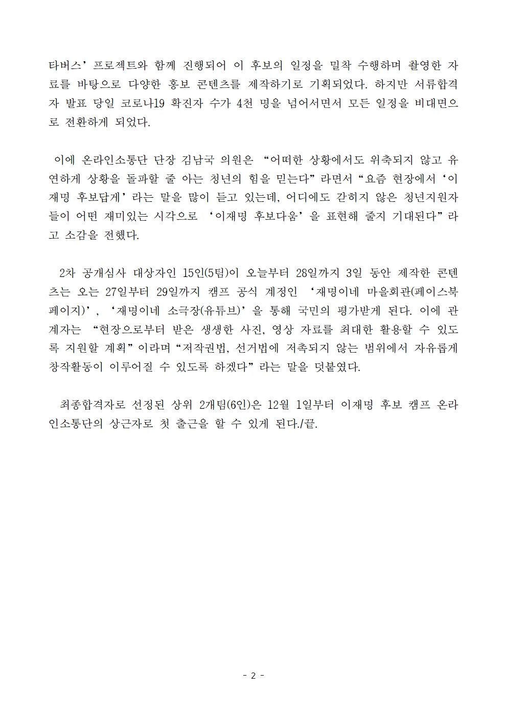 [보도자료] "CO-WORK! 2030 청년과 함께하는 캠프!" 이재명 캠프 2030 청년 상근자 공개심사 진행