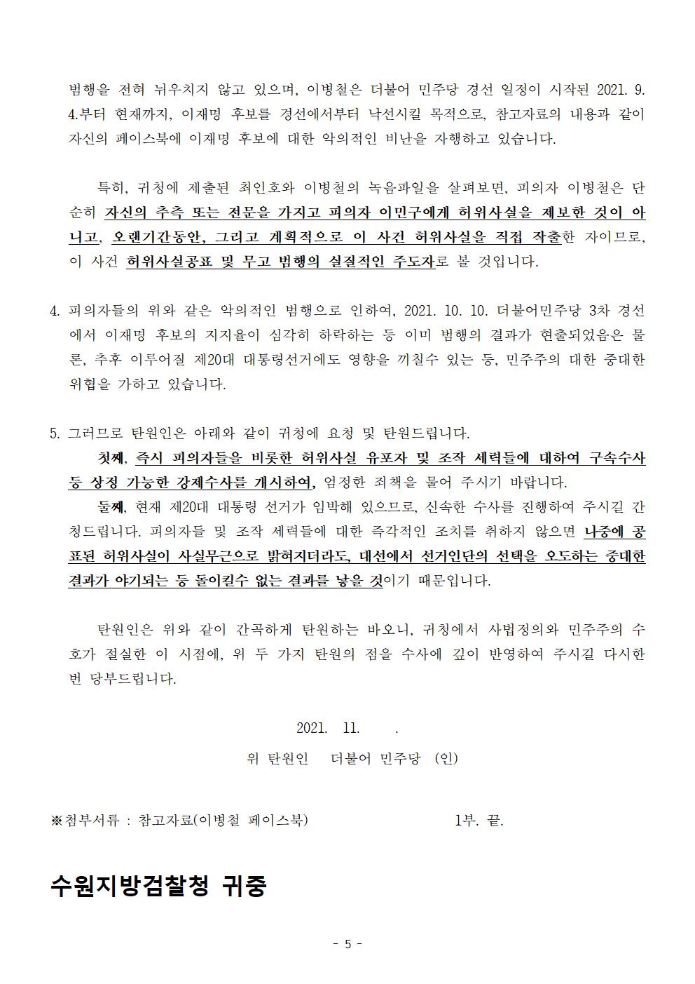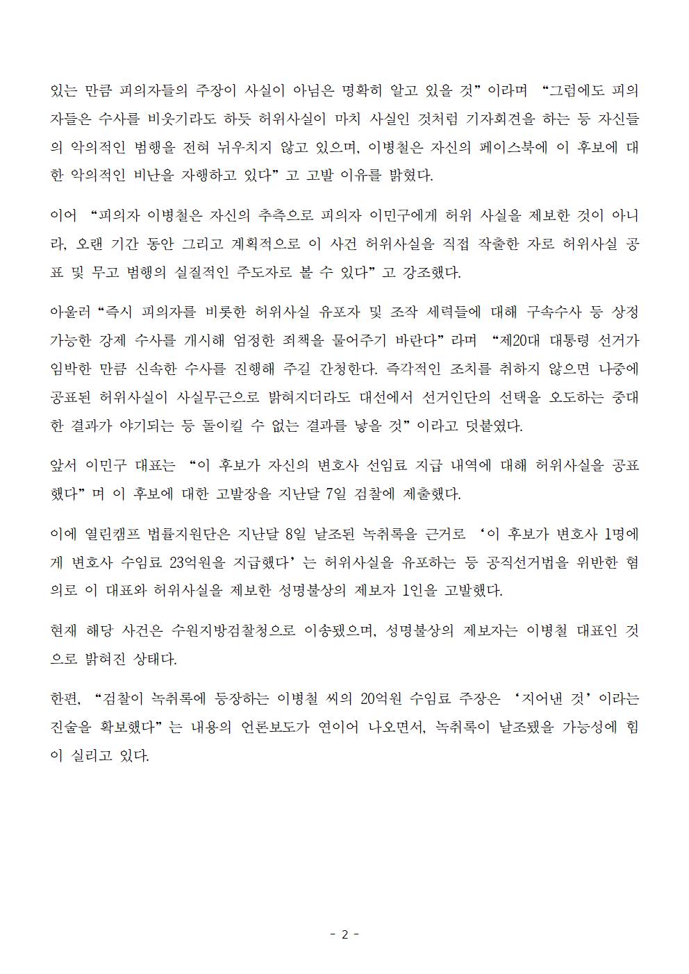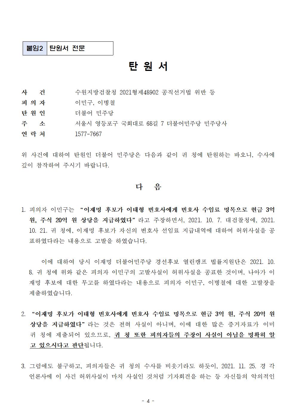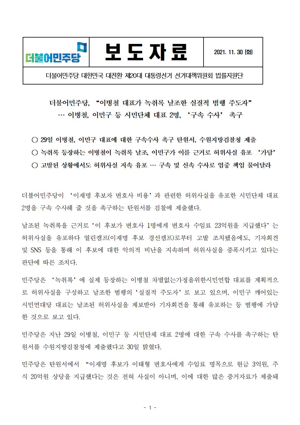 [보도자료] 더불어민주당 선대위 법률지원단, 이병철-이민구 등 시민단체 대표 2명 구속 수사 촉구 탄원서 제출