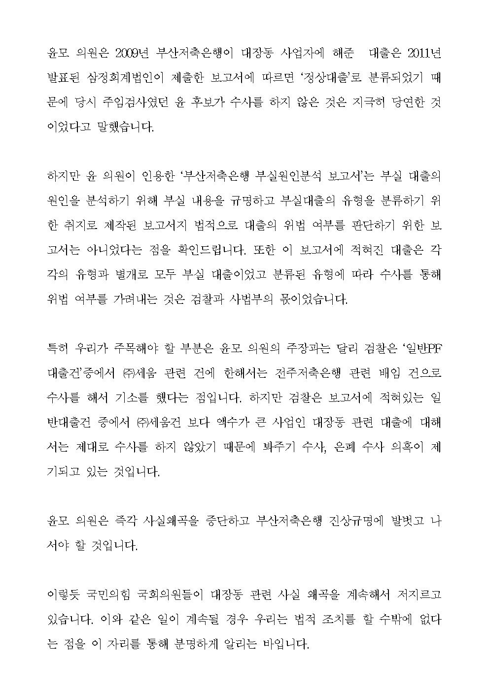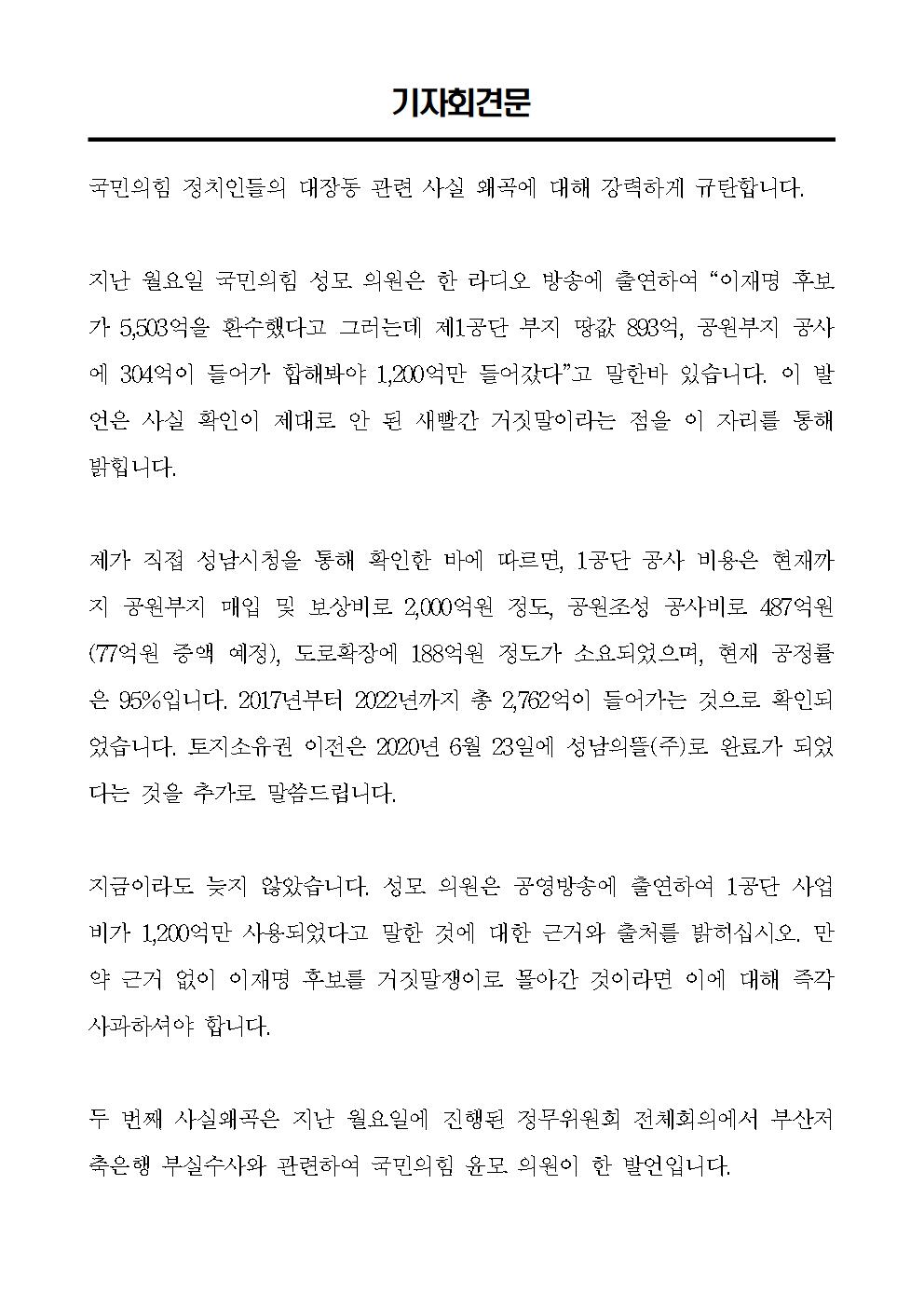 [기자회견문] 윤석열 은폐수사 및 50억 클럽 진상규명 특별위원회, 대장동 및 부산저축은행 관련 국민의힘 사실왜곡 규탄