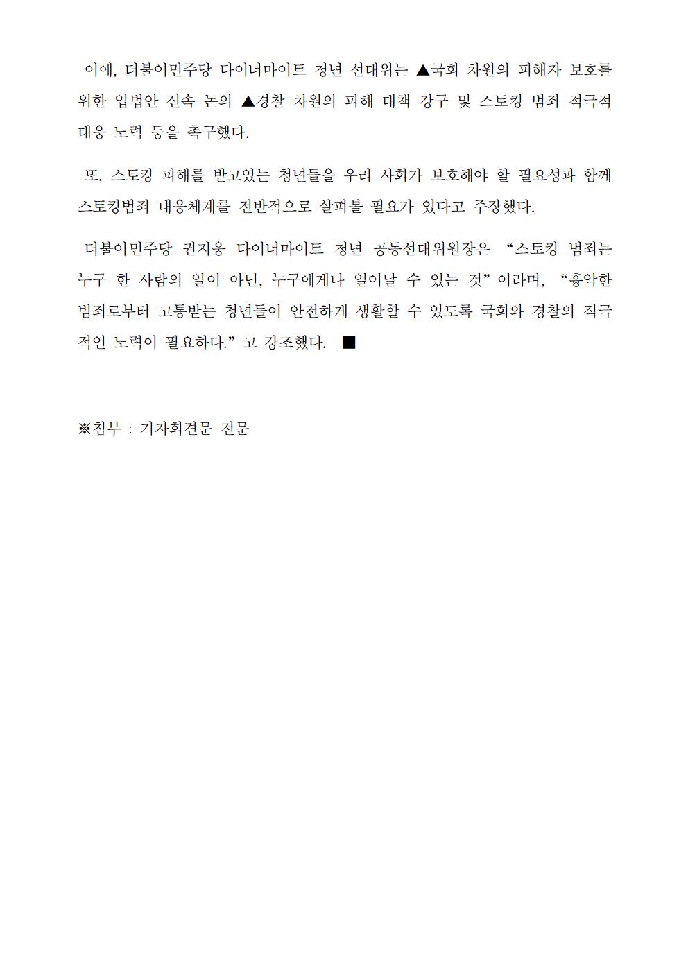 [보도자료] 더불어민주당 다이너마이트 청년 선대위 스토킹 범죄 대책 마련 요구 기자회견