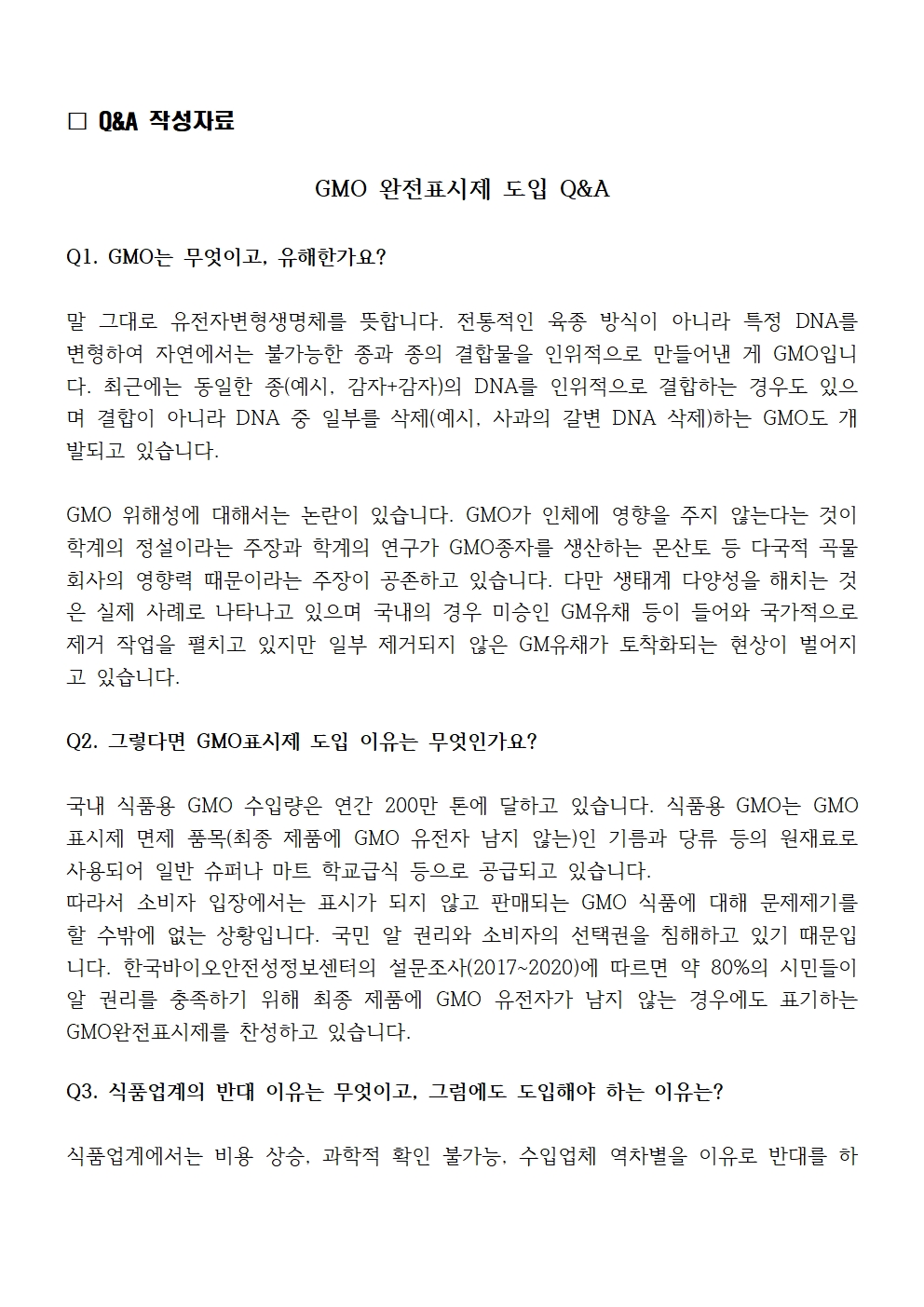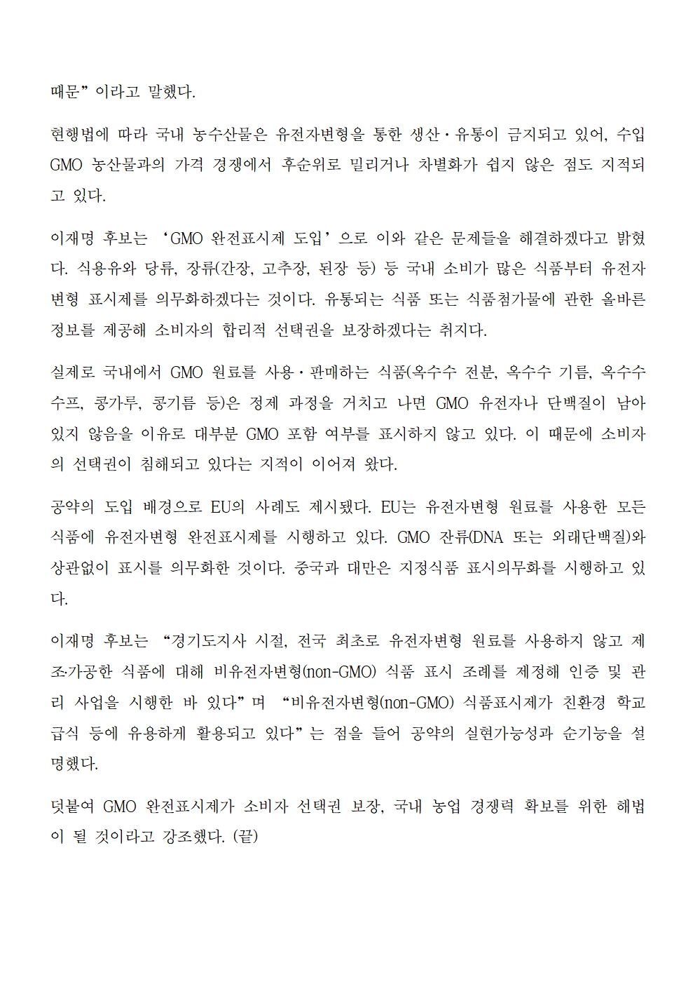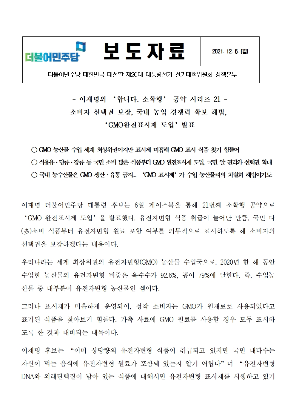 [보도자료] 더불어민주당 선대위 정책본부, '이재명의 합니다. 소확행 공약 시리즈 21' GMO 완전표시제 도입