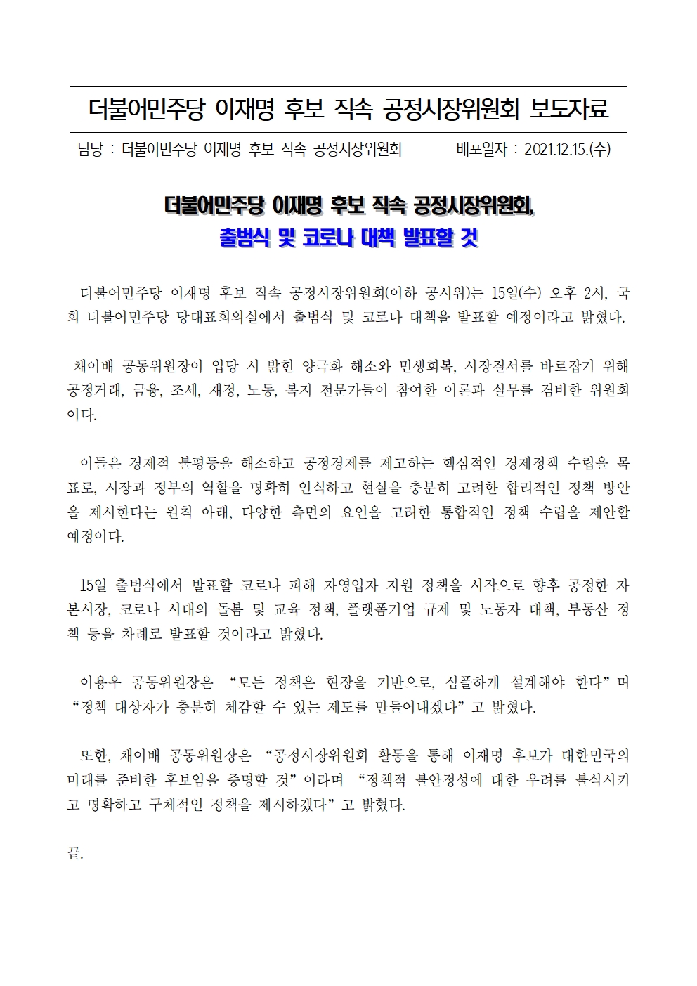 [보도자료] 더불어민주당 이재명 후보 직속 공정시장위원회, 출범식 및 코로나 대책 발표 예정