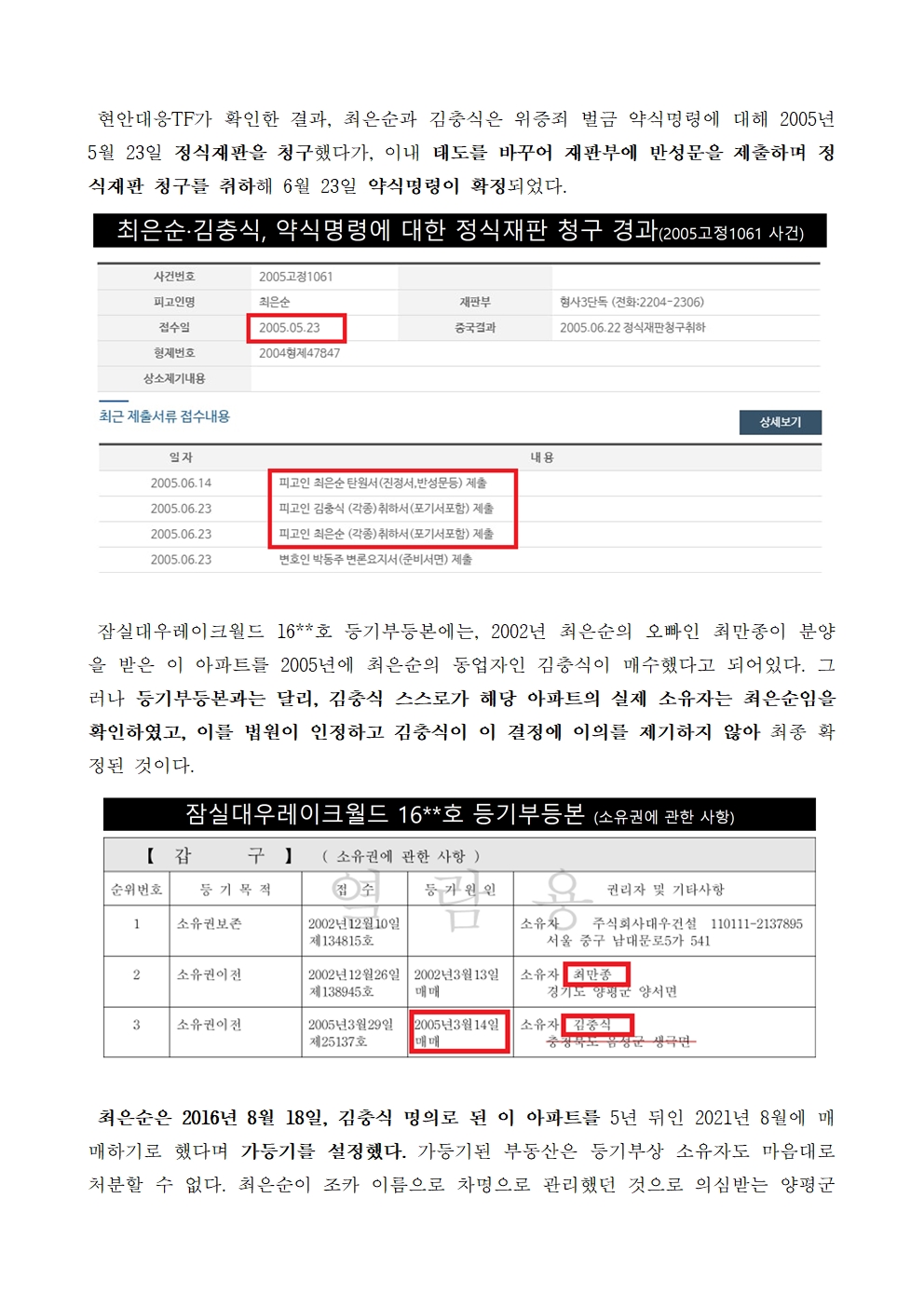 [보도자료] 더불어민주당 선대위 현안대응TF, 최은순 송파구 60평대 고급아파트 차명보유 의혹 관련 법원 약식명령서 등 공개