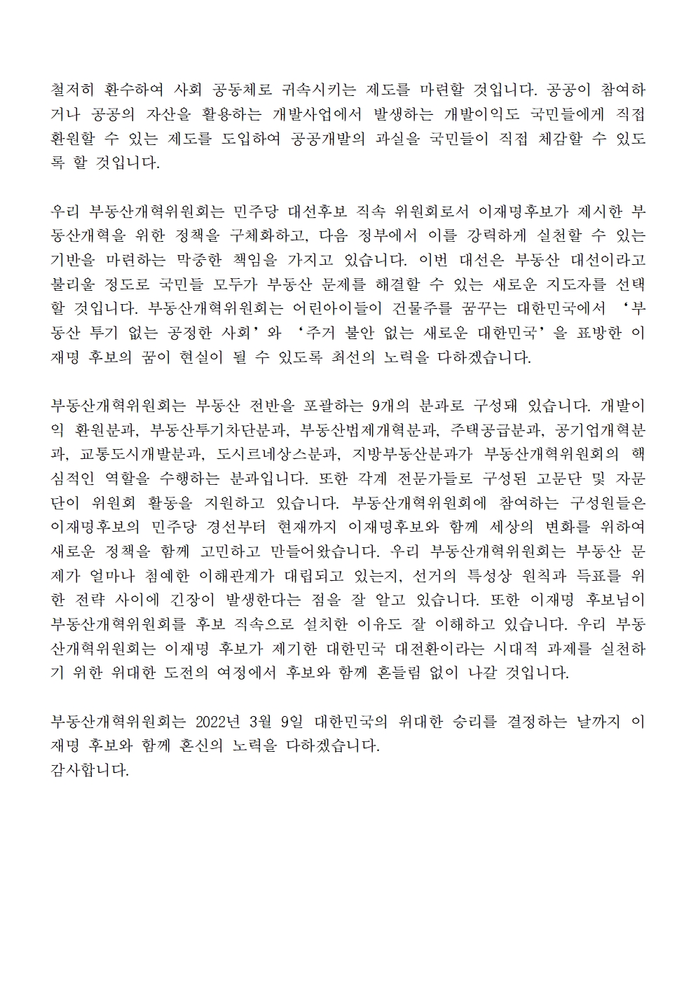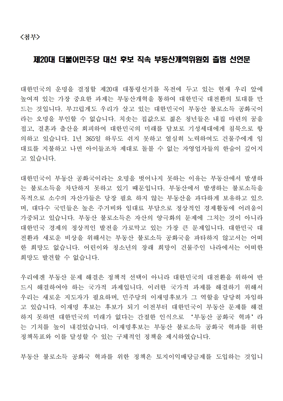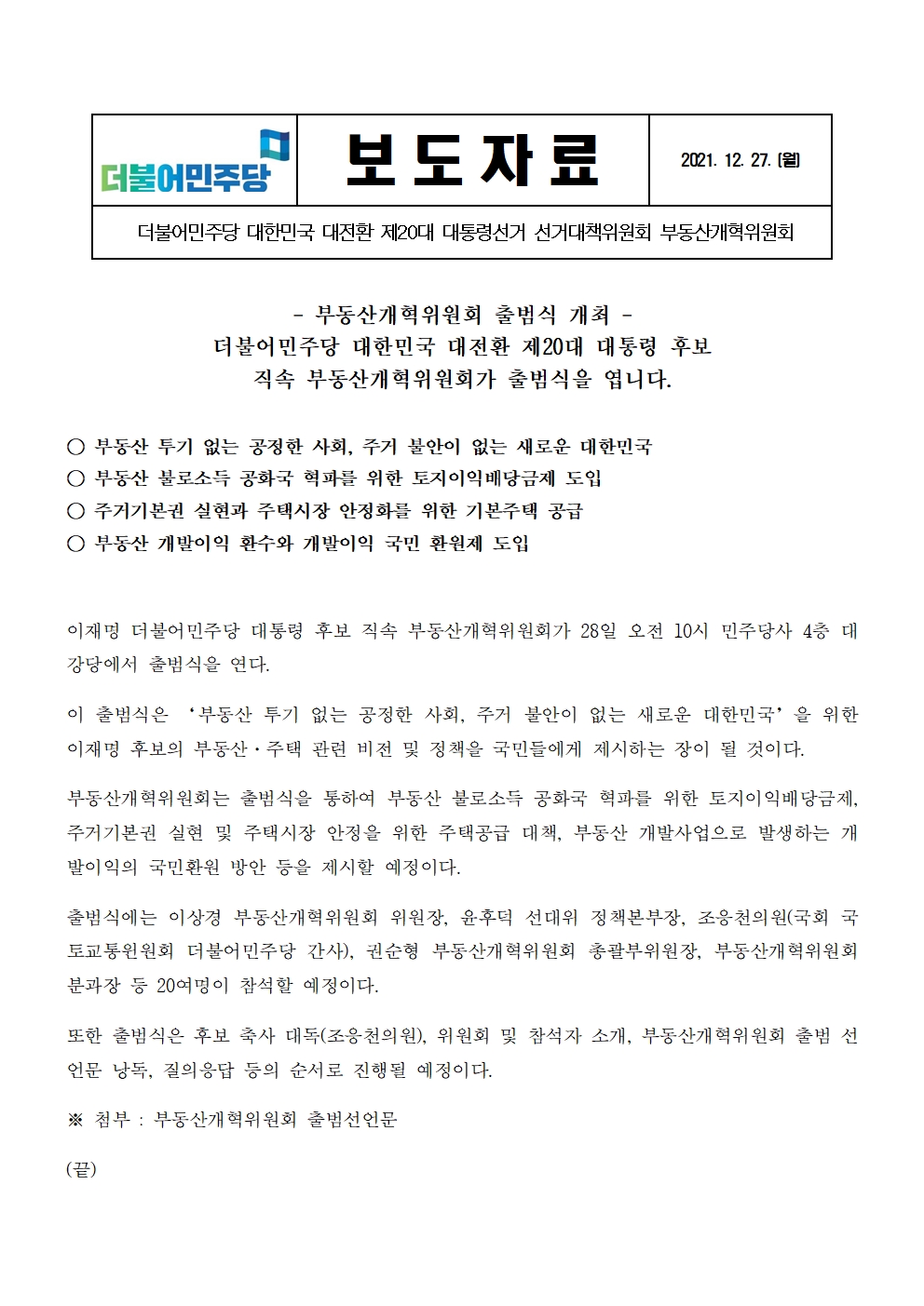 [보도자료] 더불어민주당 선대위 부동산개혁위원회 출범식 개최